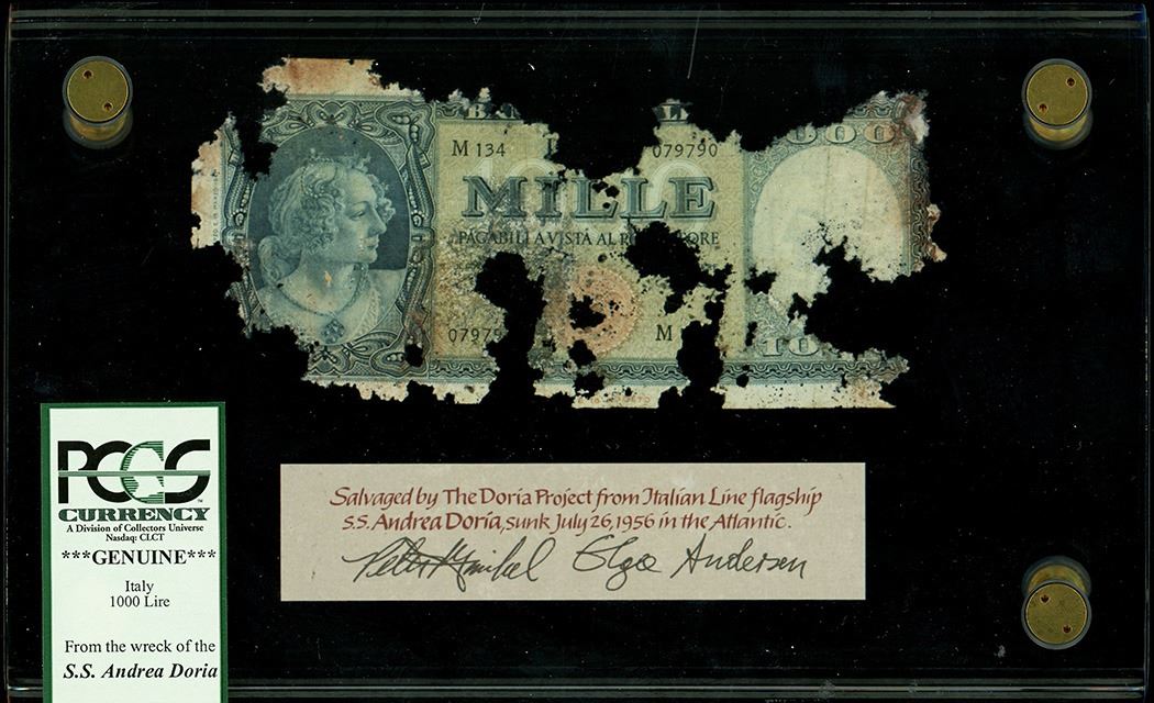 Italy, 1,000 lire, no date (1947-51), serial M134 079790, salvaged from the Andrea Doria (1956), in large acrylic display and promotional case, PCGS grade Genuine. Degradation from saltwater immersion, full serial number and woman's portrait visible, typical quality of Andrea Doria-recovered Italian lire which degraded more heavily when compared to the silver certificates due to different paper used. The note is encased in a lucite holder contained in a display box and comes with a salvager's certificate. PCGS #80019847. Recovered from: Andrea Doria, sunk in 1956 off Massachusetts