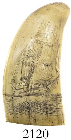 Ivory sperm whale tooth with ca.-1880s scrimshaw depicting a three-masted clipper ship. 420 grams; 6" x 2-3/4" x 1-3/4". Solid and intact ivory with detailed design in a primitive style, good patina.