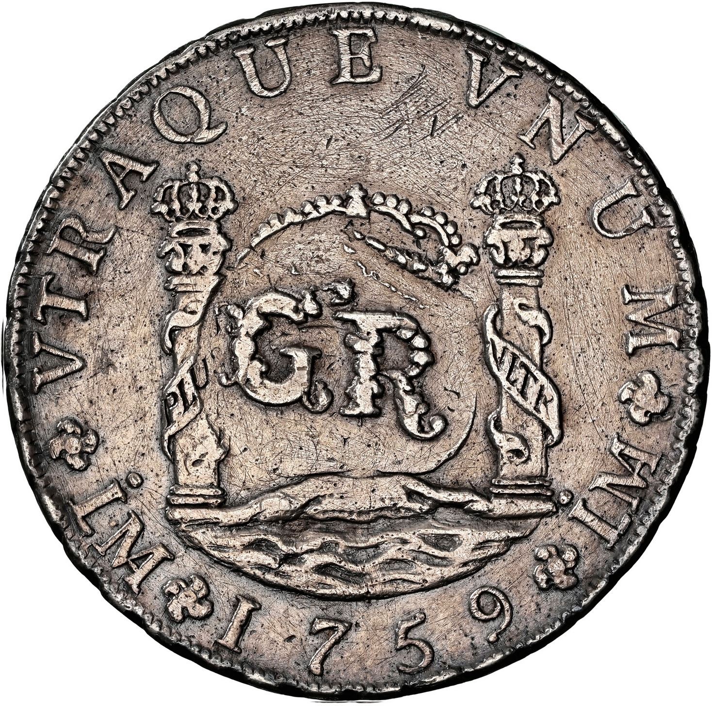 JAMAICA (British Administration), 6 shillings 8 pence, George II, GR double countermark (1758) on a Lima, Peru, pillar 8 reales, Ferdinand VI, 1759 JM, NGC XF details / mount removed (c/s XF strong), ex-Brameld. KM-4.4. Very lightly toned over lustrous surfaces that are slightly grainy (presumably from jewelry use), the countermarks, incorrectly identified as a Mexico host coin on part of slab label, overall a decent example of a popular issue. Pedigreed to the David Brameld Collection.