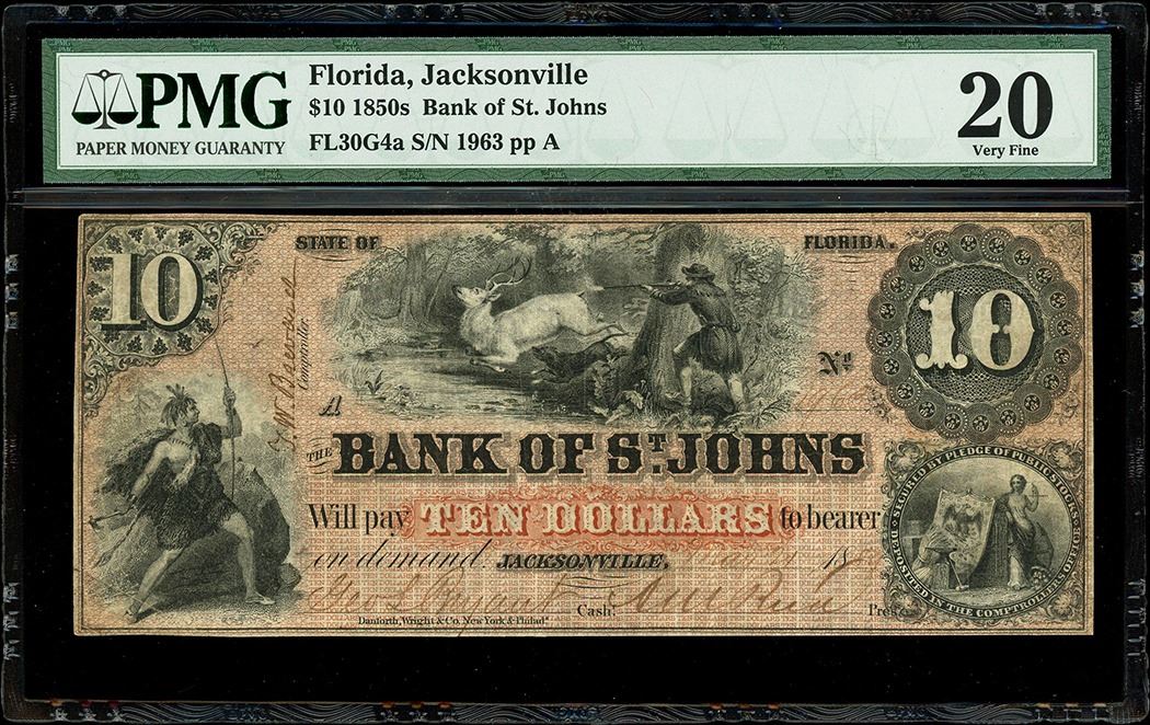Jacksonville, Florida, Bank of St. Johns, $10, 21-3-1859, serial 1963, plate position A, PMG VF 20. Haxby-FL30G4a. Scarce and popular Florida obsolete featuring a large central vignette of a hunter shooting a white stag along with a Native American depicted to the left. Boldly inked signatures, well-cut margins, pencil annotation on reverse, single closed pinhole at center (as noted by the PMG holder). PMG #5012283-005.