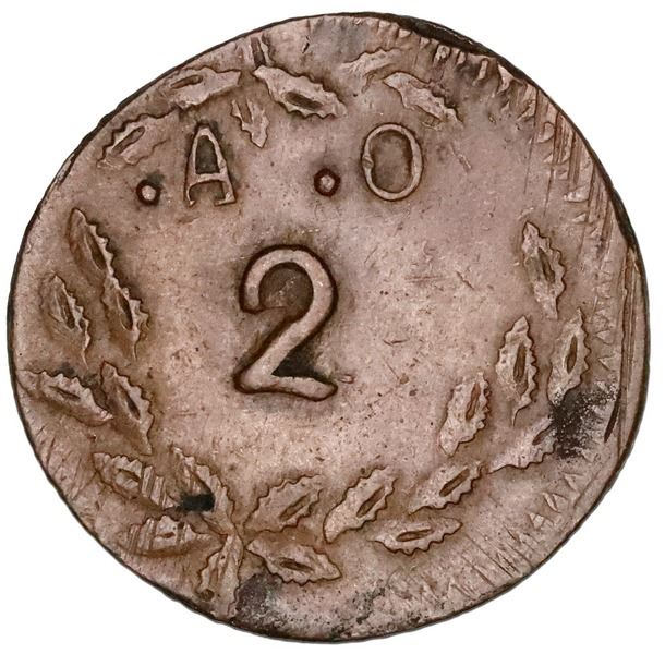 Jalisco, Mexico, bronze 2 almudes token, Apoloni Ochoa, ca. 1890. Rulau-Jal49; Eklund-164. 5.44 grams; 24.5mm. Obverse with CONTLA (with backwards N) between rows of dots with clusters of agave(?) leaves above and below; reverse with .A.O (for Apoloni Ochoa) above 2 within wreath of same leaves. Bold strike, AXF, the reverse off-center, light brown color throughout.