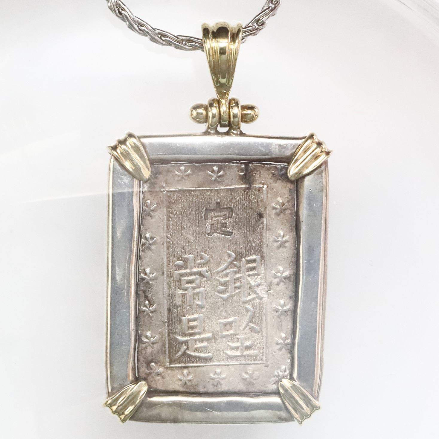 Japan, 1 bu ("samurai coin"), mid-1800s, mounted in thick silver bezel with 14K gold prongs and shackle bail, with 18" silver chain. 22.76 grams total. Large rectangular silver coin, XF, with Japanese characters on both sides in a sturdy custom-made mounting with pretty twisted-link silver chain, can be worn either side. With photo-certificate.
