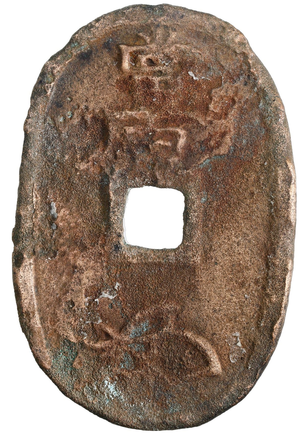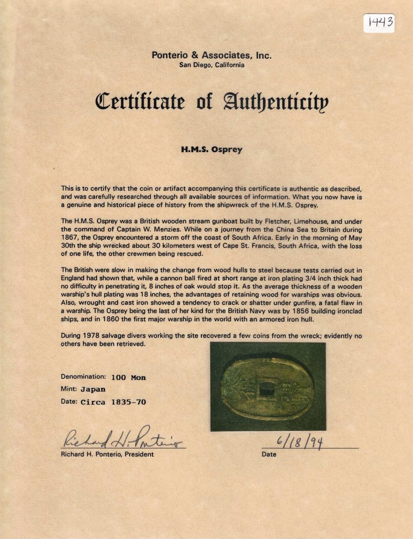Japan, bronze 100 mon (Tempo Tsuho), shogunate, no date (1835-1870), very rare provenance. KM-7. 14.46 grams. Very rare provenance (the first we have offered from this wreck) and probably from a passenger's effects. A rather impressive survivor given the effect of saltwater on bronze with some surface pitting yet most of the detail still visible. With Ponterio photo-certificate from 1994. Recovered from: H.M.S. Osprey, sunk in 1867 off South Africa.