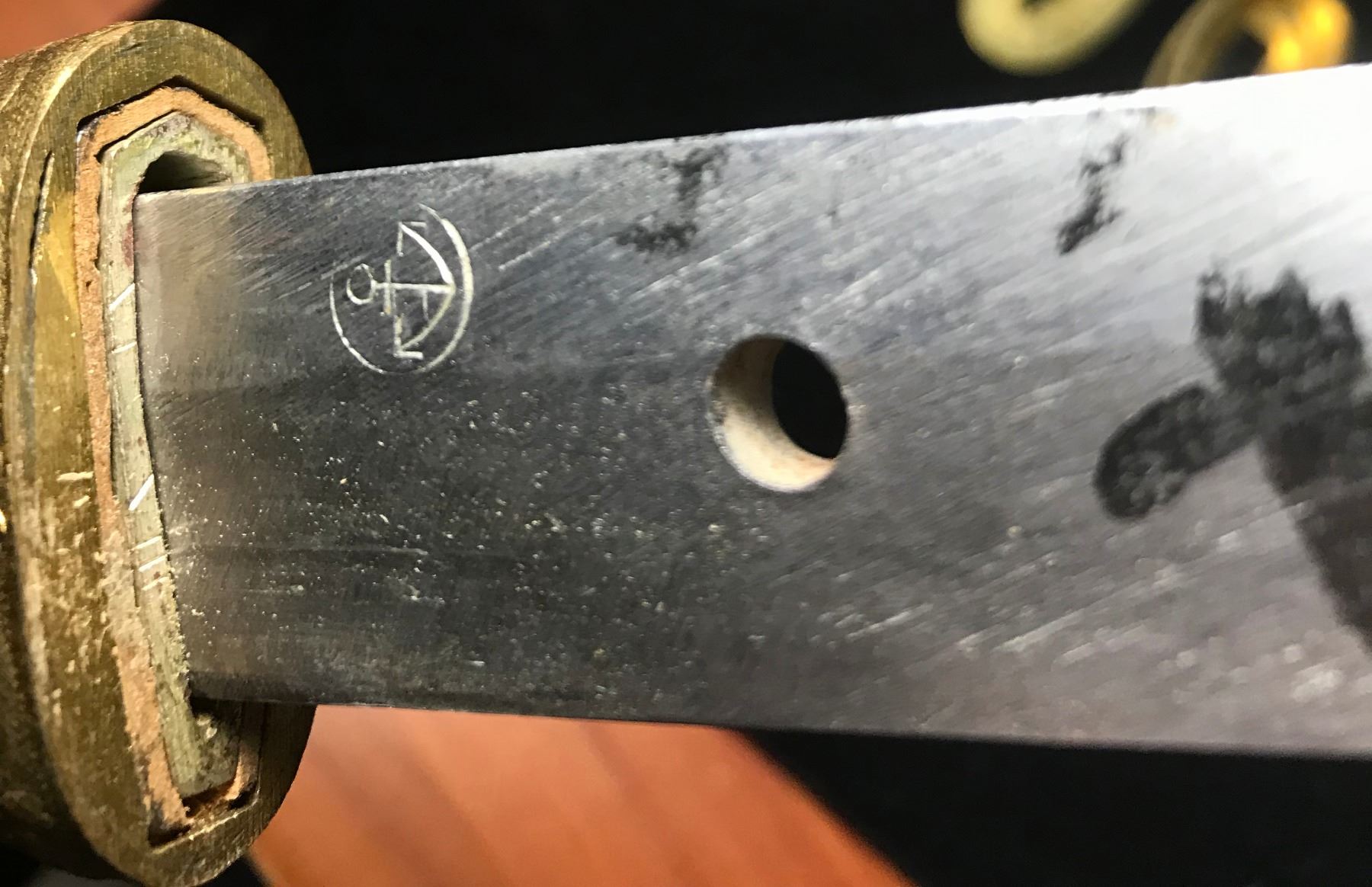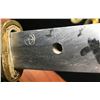 Japanese katana ("samurai sword") with scabbard, mid-1900s. 1360 grams, 40" long, 30" blade. The katana was the main battle weapon of the samurai. This one, the first we have offered, is a traditional sword with a black lacquered wood scabbard, sharpened stainless steel blade (slight blade imperfection near tip), golden cord artistically wrapped around handle with shark skin underneath, and gold-toned metal embellishments that lend dignity and beauty, a real showpiece for the collector.