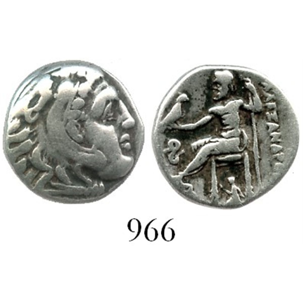 KINGS of MACEDON.336-323 BC. AR drachm. Possibly Lampsacus mint. Price 1379. Mueller 631. 4.1 grams. Head of Herakles right, wearing lion skin / Zeus seated left; symbol before and under throne. Fine with toning around details.