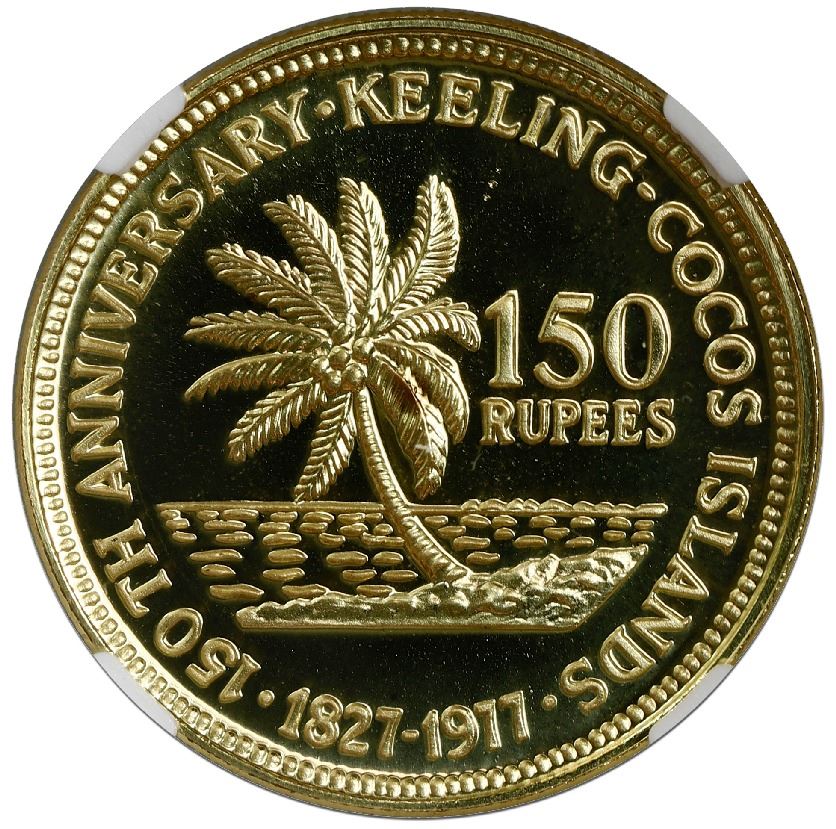 Keeling-Cocos Islands, gold proof 150 rupees, 1977, fineness .916, NGC PF 68 Cameo. KM-X10a. Brilliantly lustrous in bright yellow gold, with just a faint touch of cloudiness and just a couple minor blemishes, second highest grade in NGC census. NGC #5901720-006.