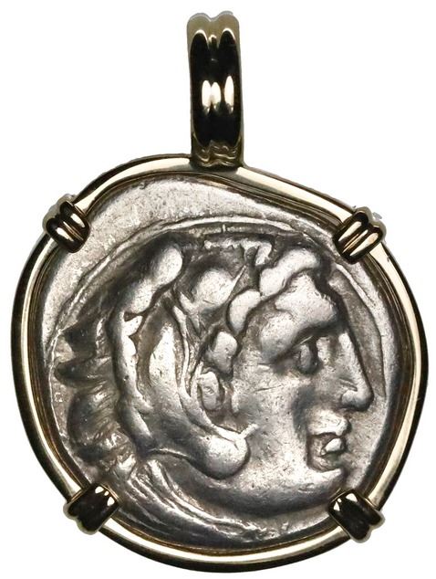 Kingdom of Macedon, AR drachm, Alexander III (the Great), 336-323 BC, mounted head-side out in 14K bezel. 5.48 grams total. Head of Herakles right, wearing lion's skin headdress / Zeus seated left, holding eagle in right hand, sceptre in left. Small and delicate custom gold setting with fixed gold double-wire bail, four double-wire prongs, the coin VF with full head.