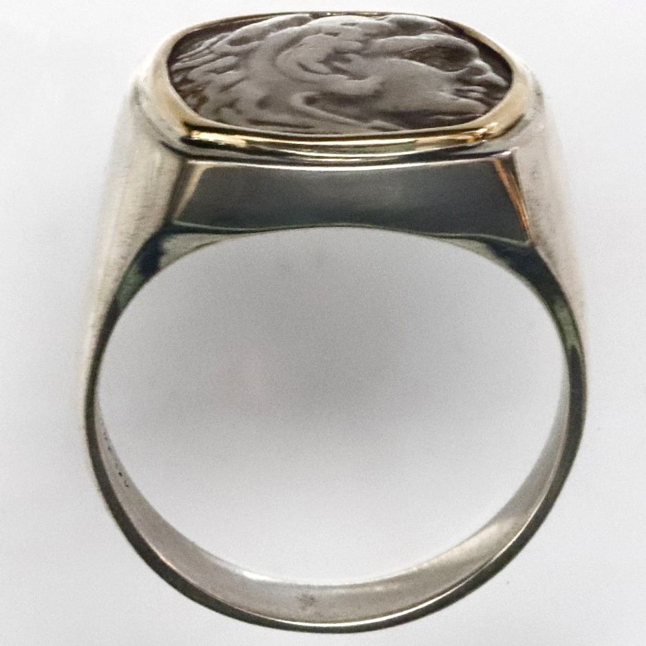 Kingdom of Macedon, AR drachm, Alexander III (the Great), 336-323 BC, mounted head-side out in silver men's size 10 ring with 14K gold accent. 13.07 grams total. Head of Herakles right, wearing lion's skin headdress / Reverse not visible. Lovely solid setting of smooth silver for VF drachm framed into a mostly square gold-and-silver setting, underside covered by silver.