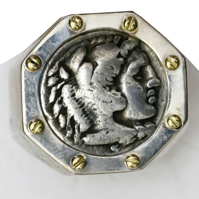 Kingdom of Macedon, AR drachm, Alexander III ("the Great"), 336-323 BC, mounted portrait side out in silver men's ring (size 9-3/4) with eight 14K gold dots around octagonal face. 12.42 grams total. Detailed coin with contrasting dark toning in recessed areas, reverse design visible through ring.