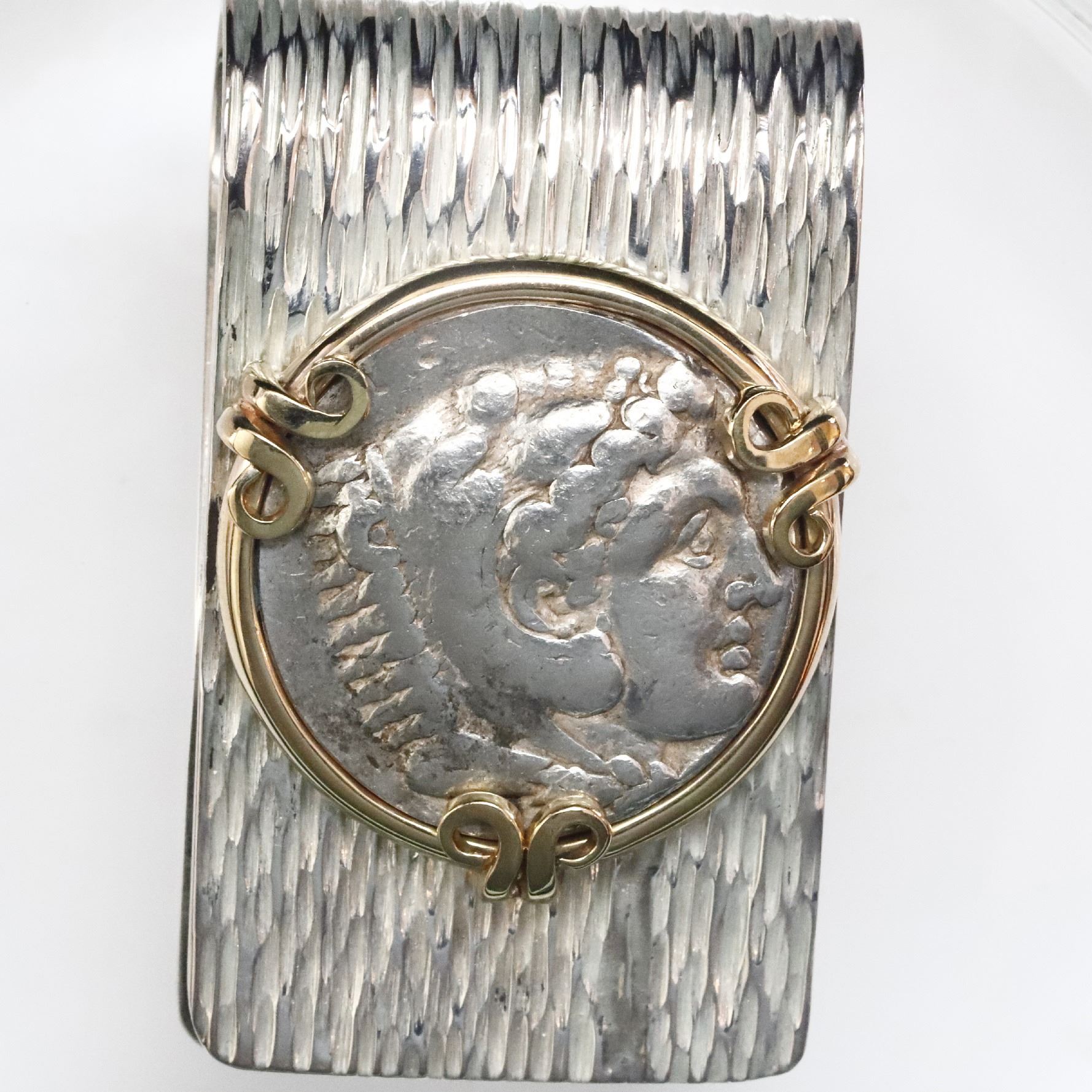 Kingdom of Macedon, AR tetradrachm, Alexander III (the Great), 336-323 BC, mounted head-side out in 14K gold bezel with 14K gold looped prongs on a silver money clip. 61.42 grams total. Head of Herakles right, wearing lion's skin headdress / Reverse not visible. Hefty money clip with rather worn VF coin, brightly colored, and interesting stipple design on clip.