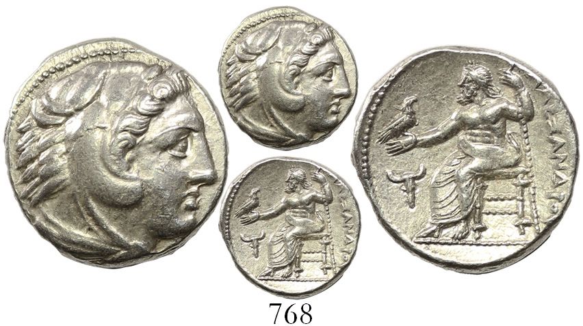 Kingdom of Macedon, AR tetradrachm, Alexander III (the Great), lifetime issue (legs of Zeus not crossed), ca. 325-323 BC, Amphipolis mint. Price 93; Troxell E8. 17.22 grams. Head of Heracles right wearing lion-skin headdress / Zeus seated on backless throne left, holding eagle on outstretched right hand and scepter in his left; bucranium in left field. Well-centered and lustrous AU.