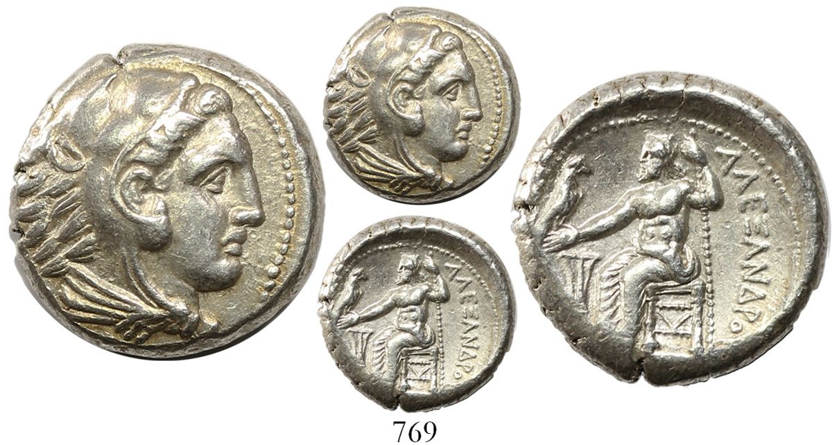 Kingdom of Macedon, AR tetradrachm, Alexander III (the Great), lifetime issue (legs of Zeus not crossed), ca. 325-323 BC, Amphipolis mint. 17.11 grams. Head of Herakles right, wearing lion-skin headdress / Zeus seated on backless throne left, holding eagle on outstretched right hand and scepter in his left; Lustrous AU-, struck slightly off-center.