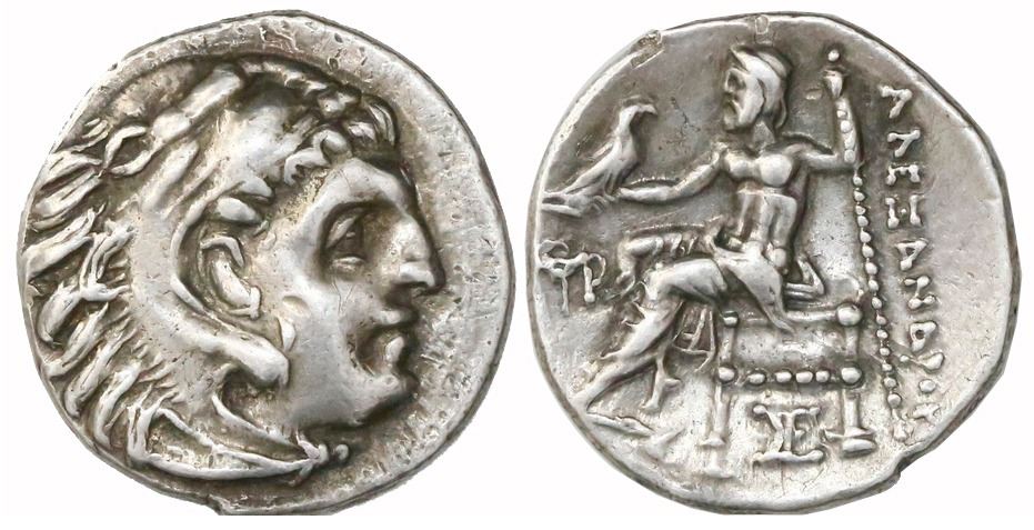 Kings of Macedon, AR drachm, Alexander III ("the Great"), 336-323 BC. 4.04 grams. Head of Herakles right, in lion skin headdress / Zeus seated left. Bold VF with nice toning.