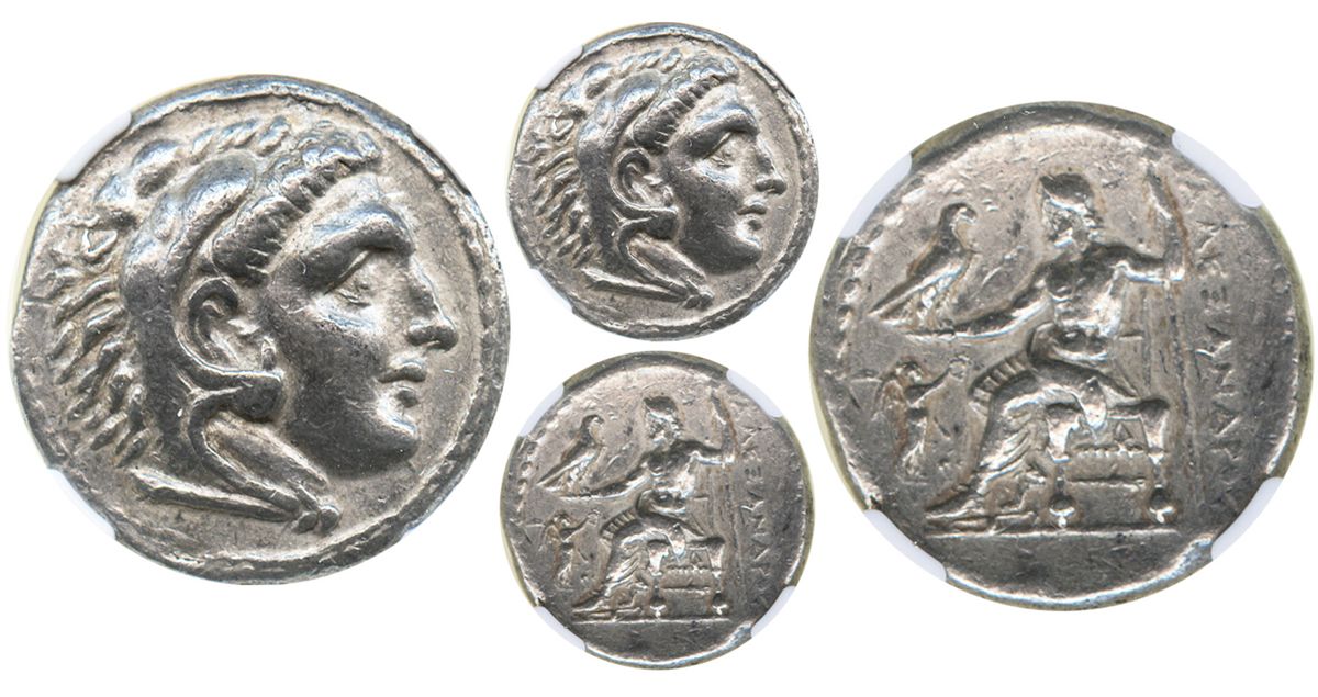 Kings of Macedon, AR tetradrachm, Alexander III (the Great, 336-323 BC), Corinth mint, ca. 310-290 BC, encapsulated NGC XF (strike 5/5, surface 4/5). Similar to Price-676 and 679. Head of Herakles right, wearing lion skin headdress / Zeus seated left, holding eagle and scepter; in left field, Nike standing right, holding wreath; below throne, NO. Bold strike, well detailed and lustrous, with hint of toning, also well centered, looks like AU to us.