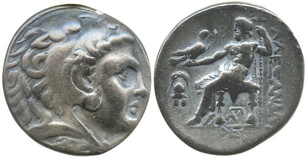Kings of Macedon, AR tetradrachm, Alexander III (the Great, 336-323 BC), Pella mint (?), ca. 275-270 BC. Price- 629; Mueller 233. 16.8 grams. Head of Herakles right in lionskin headdress / Zeus seated left with eagle and sceptre; crested helmet left, monogram under throne, monogram in exergue. Deeply toned AVF, well-centered strike.