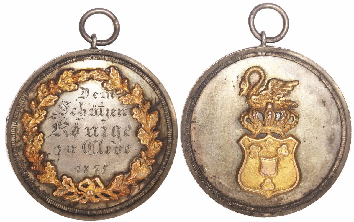 Kleve (Cleves), Germany, silver shooting medal with gold accent, 1875, rare. 27.30 grams, 46mm. Hollow piece with applied elements in gold accent showing arms topped with crown and goose on one side and wreath on other side, with "Dem / Schützen / Könige / zu Cleve / 1875 engraved inside wreath, nicely toned silver, with tiny loop and jump-ring at top.