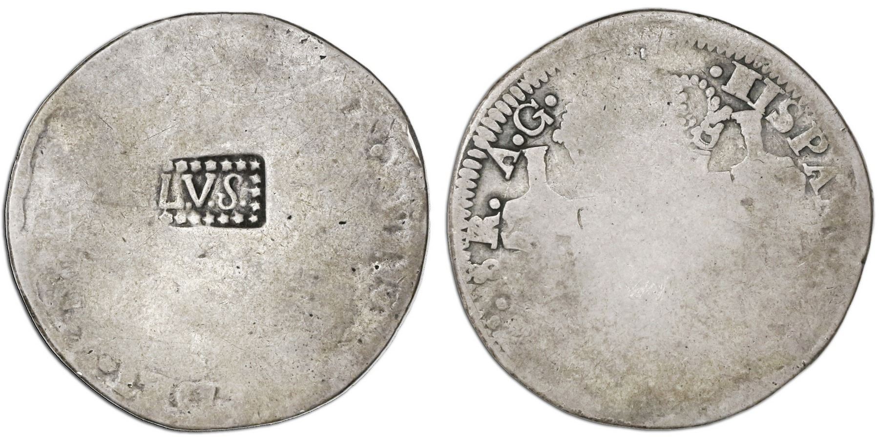 L.V.S. (Labor Vincit Semper or La Villa de Sombrerete) countermark on a cast Zacatecas, Mexico, bust 8 reales, Ferdinand VII, 1814AG, NGC Fair 2, c/s XF standard. KM-unl (264.2 for type). Bold and well-detailed countermark consisting of LVS inside border of dots in an incuse rectangle, the host coin nearly slick but with bold assayer and just enough of the date to attribute, light toned all over (dark inside countermark). NGC #4740661-006.