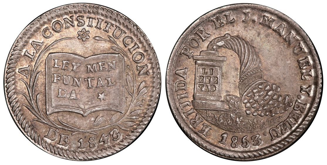 La Paz, Bolivia, 1 sol, 1853, muled with Potosi 1 sol of 1843, PCGS MS64, ex-Derman. Burnett-unl (obv as rev 24, rev 60B; Fonrobert-unl. Obverse with open-book Constitution with LEY / FUN / DA on left page and MEN / TAL / * on right page within wreath inside legend A LA CONSTITUCION / DE 1843; reverse with cornucopia spilling right with point on altar to left that says LI / BER / TAD, all within legend ERIJIDA POR EL J.MANUEL Y. BELZU. with date 1853 at bottom; plain edge with corded rims. Another crazy mule from La Paz, this one with bold strike, choice rich toning over muted luster, no wear or marks. Pedigreed to the Alberto "Coco" Derman collection (Cayon auction of December 2007, lot #831). PCGS #32915144. The Whittier Collection of Bolivian Monetary Medals