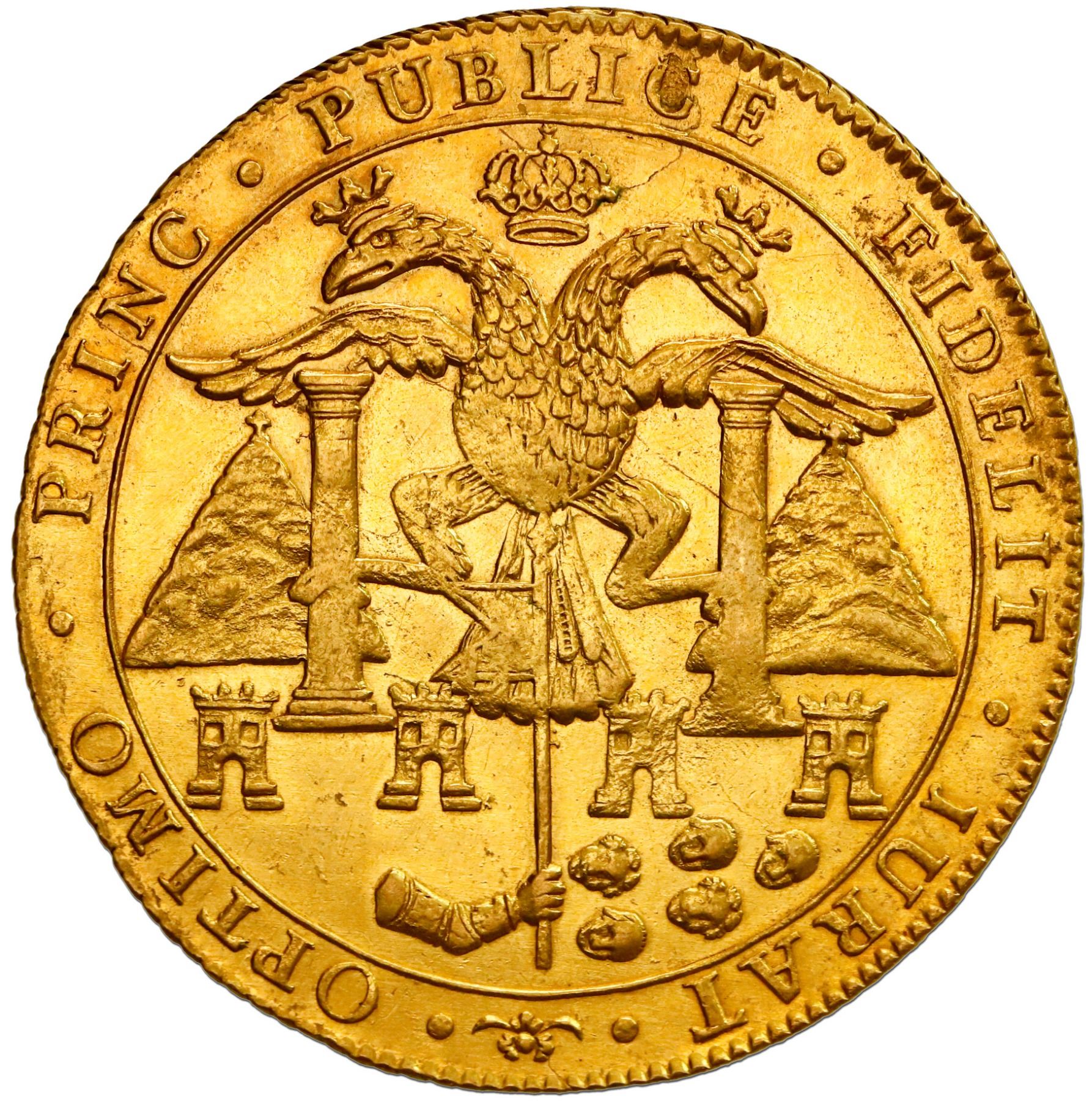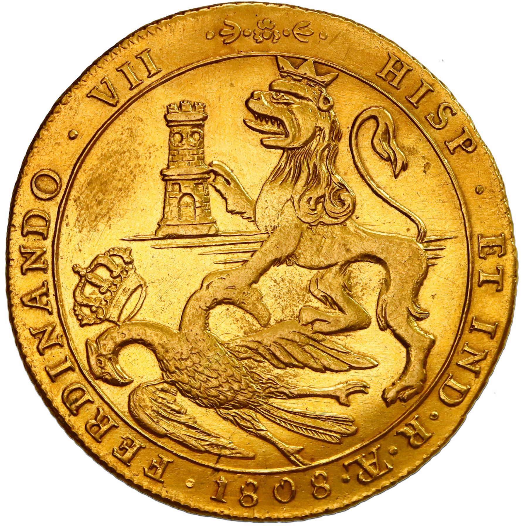 La Plata, Bolivia (minted in Potosi), gold 8 escudos proclamation medal, Ferdinand VII, 1808, by Moncayo, very rare. Medina-311; Herrera-26 (in silver). 26.97 grams; 37 mm. This is a very important medal that has yet to see its proper potential in multiple appearances in both European and American auctions (with only one other example appearing in the meantime). The famous Argentine numismatic historian Arnaldo Cunietti-Ferrando (quoted in an article by Luciano Pezzano in 2014) described it thus: "The most magnificent medals of oath under this king refer to the city of La Plata. They represent the arms of this city artistically displayed while the obverse shows a scene of highly developed political reference: a crowned lion holds its right claw on a castle and the left on a two-headed eagle which lies dead on the ground, thus symbolizing the fall of the Napoleonic regime in Spain." The legends read 1808 . FERDINANDO . VII . . . HISP . ET IND . R . [La Plata monogram] / OPTIMO . PRINC . PUBLICE . FIDELIT . IURAT, and the edge is diagonally reeded, as presumably struck on the flan for a Potosi 8 escudos. It is significant to note that Medina (1917) mentions an "example in gold owned by this collector" and relates details from an 1809 document about the dissemination of these medals (presumably the silver ones) to the public in a grand ceremony. In any case the present example is a beautiful medal, in lustrous AU grade, only lightly hairlined from cleaning, but also with a very expertly plugged hole at top, the overlooked presence and subsequent over-explanation of which seems to have dampened the importance and appeal, both historically and aesthetically, of what is potentially one of Bolivia's greatest numismatic treasures.