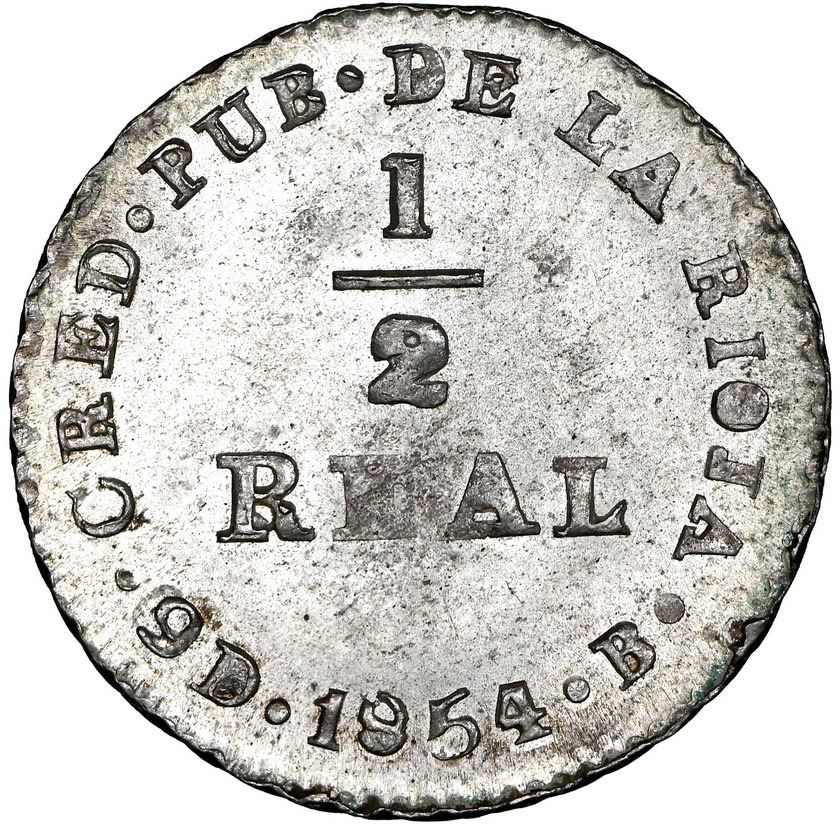 La Rioja, Argentina, 1/2 real, 1854 B, CRED. PUB. variety, NGC MS 66, finest known in the NGC census