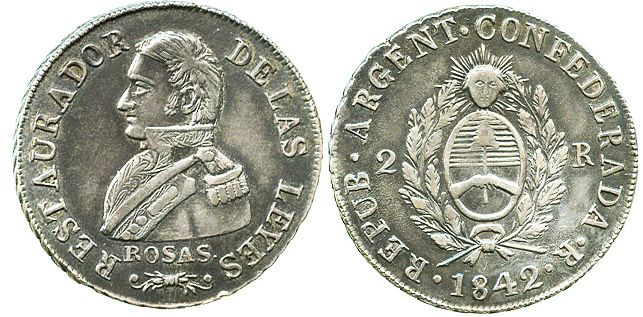 La Rioja, Argentina, 2 reales, 1842, Rosas, "DELAS" variety.