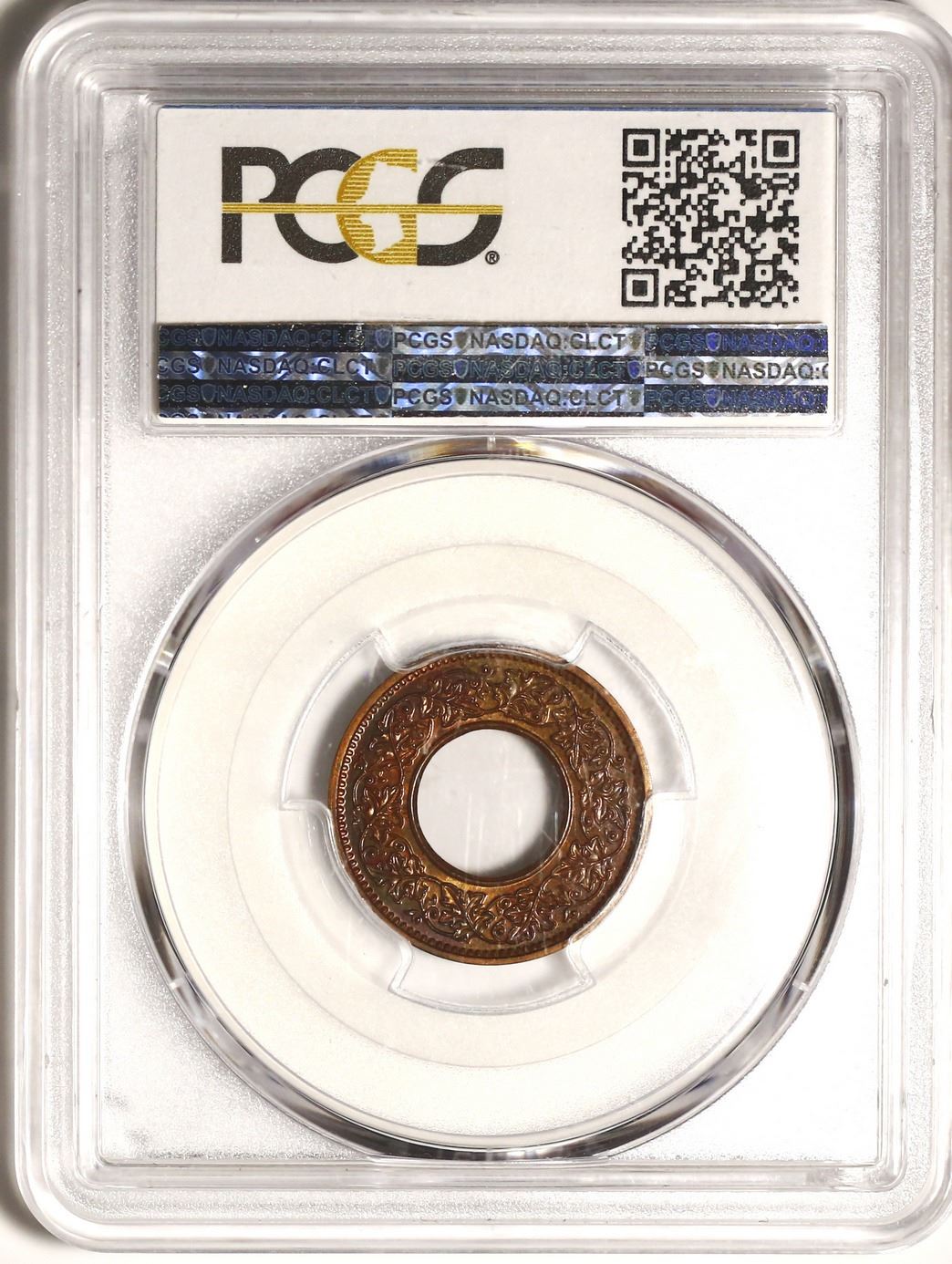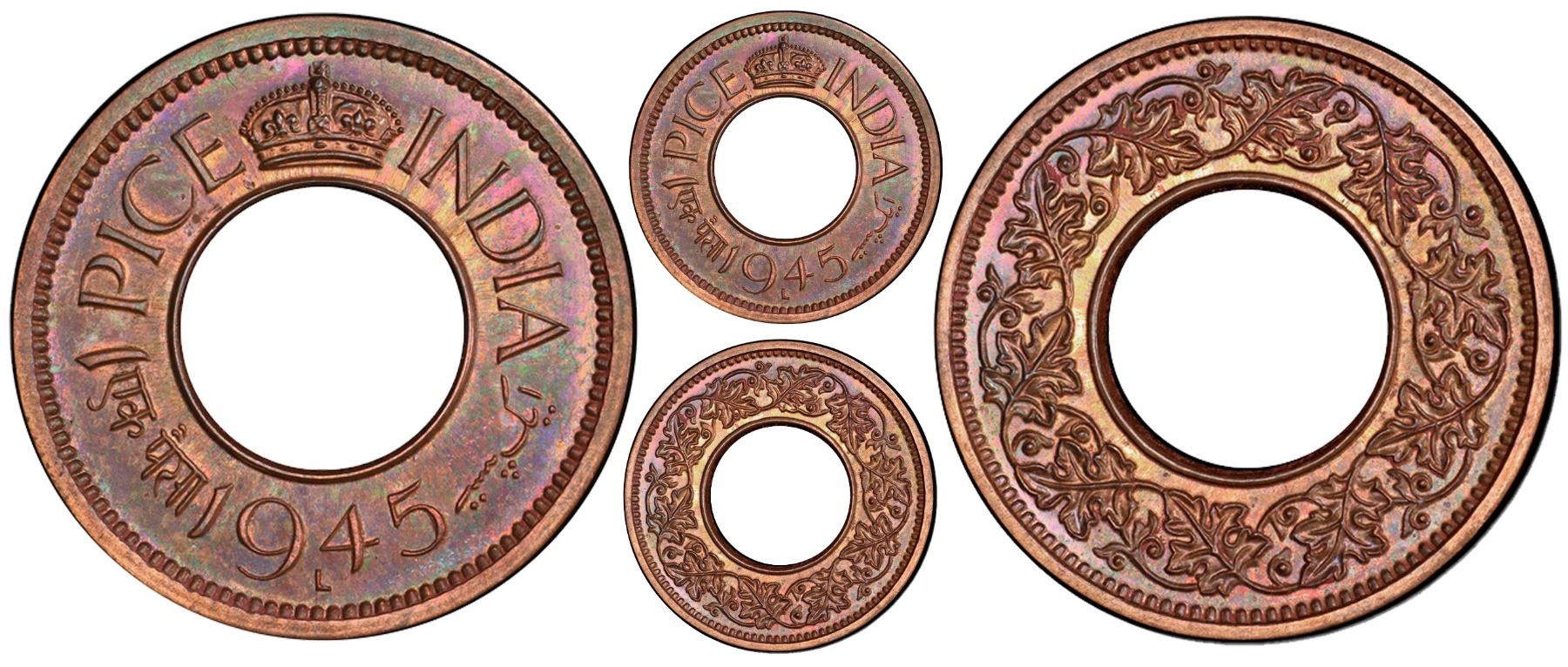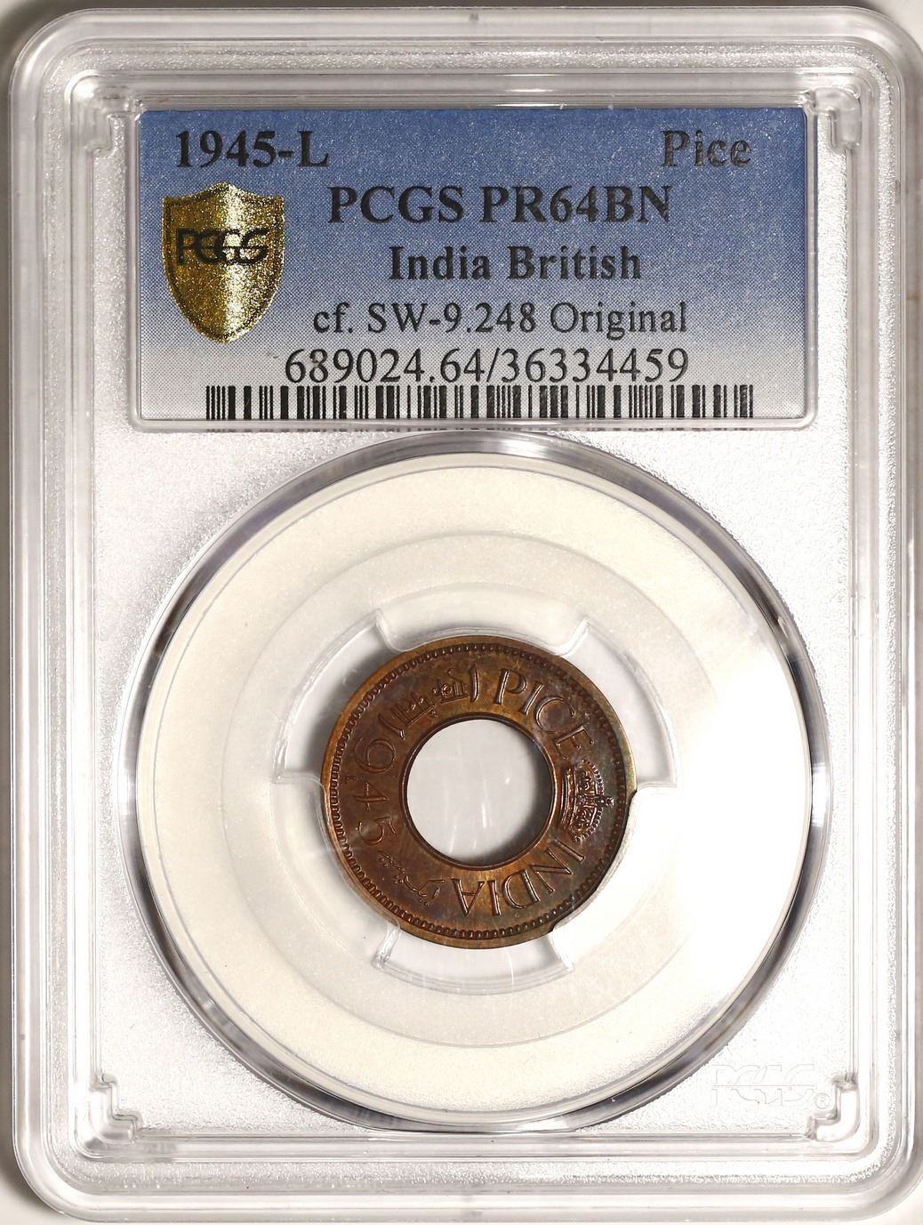 Lahore, India (British), original proof bronze pice, 1945-L, George VI, PCGS PR64BN, finest and only example in PCGS census. S&W-9.248. Choice strike and rainbow toning over luster (looks more like RB in our opinion), rare as an original proof (not a restrike) with original mint envelope, in our opinion prettier than the Pittman specimen in Baldwin's sale in 2013, numerically topped only by a PF 65 in the NGC census. (See note in lot 1132.) PCGS #36334459. With original His Majesty's Mint paper envelope.