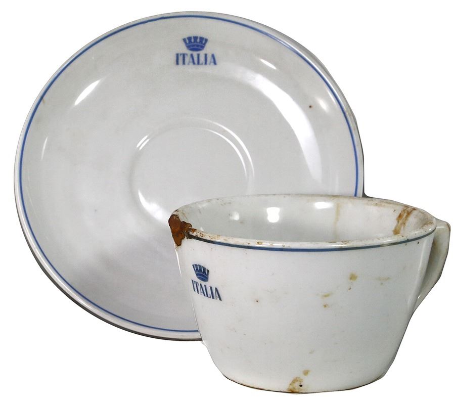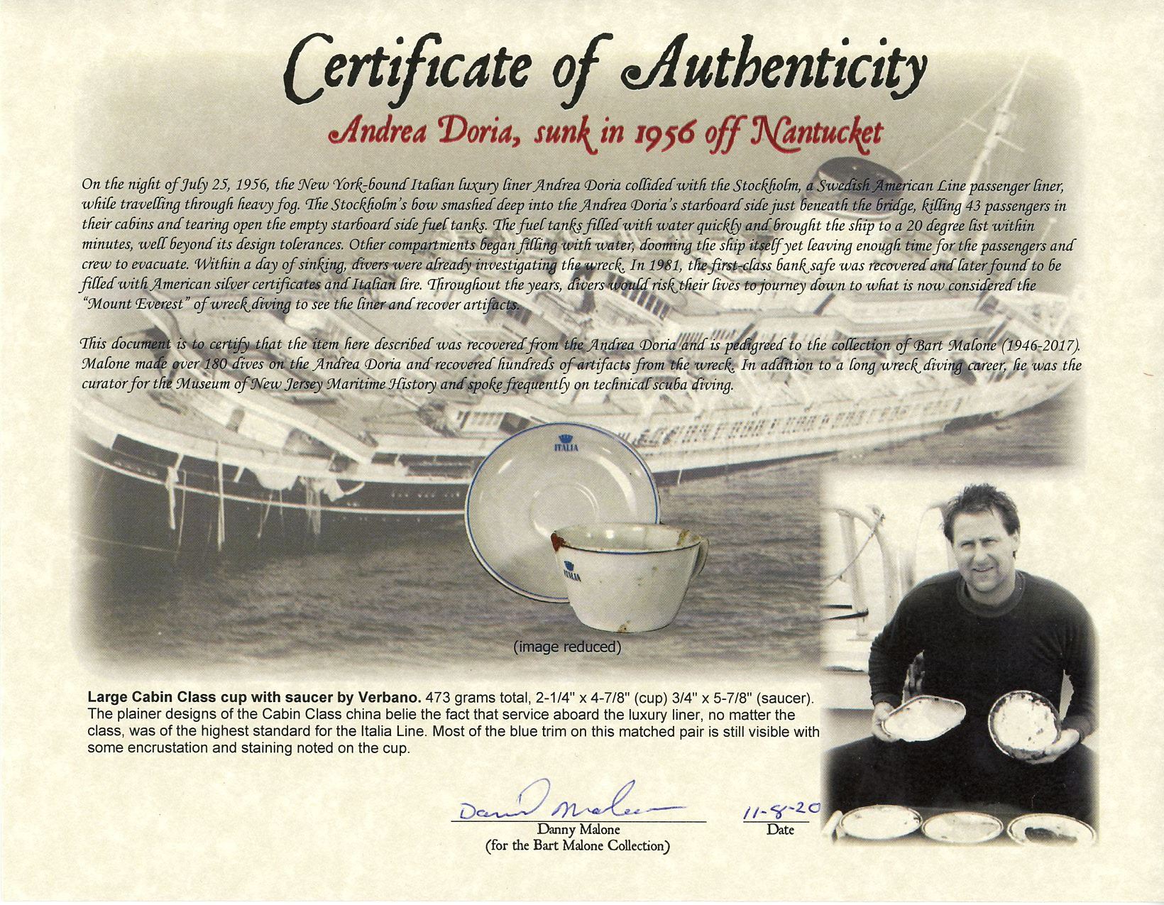 Large Cabin Class cup with saucer by Verbano, ex-Andrea Doria (1956), ex-Malone. 473 grams total, 2-1/4" x 4-7/8" (cup) 3/4" x 5-7/8" (saucer). The plainer designs of the Cabin Class china belie the fact that service aboard the luxury liner, no matter the class, was of the highest standard for the Italia Line. Most of the blue trim on this matched pair is still visible with some encrustation and staining noted on the cup. From the Andrea Doria (1956), pedigreed to the Bart Malone Collection with photo-certificate. Recovered from:Andrea Doria, sunk in 1956 off Massachusetts