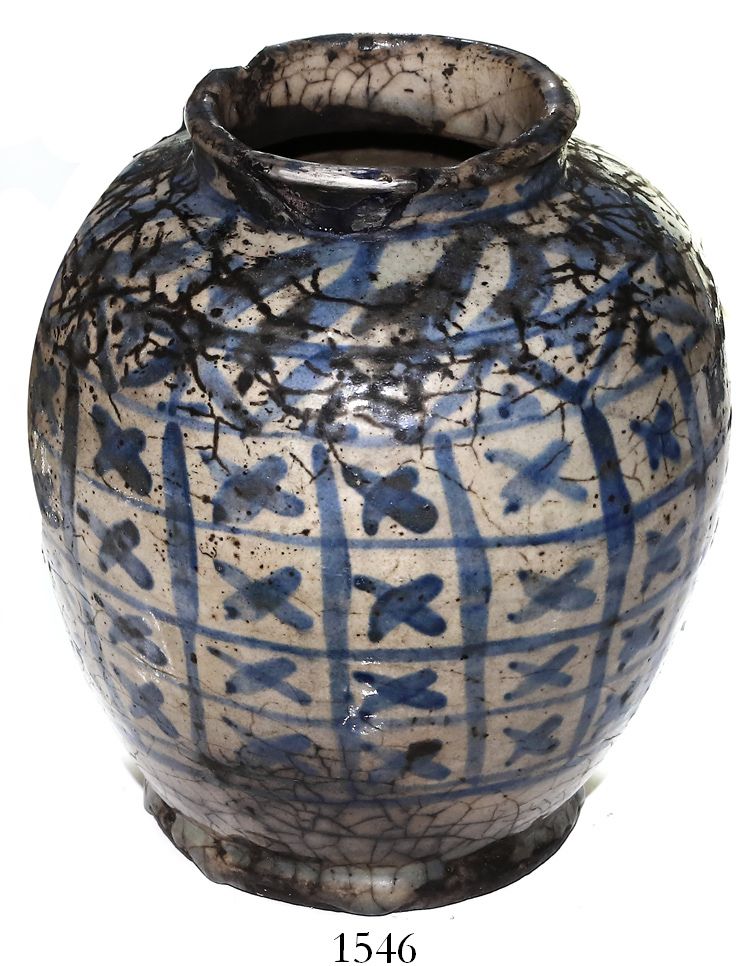 Large Chinese blue-on-white porcelain urn. 2264 grams, 10" tall and 8" in diameter. Cracked and repaired, also apparently once used as a planter (drilled hole in bottom), but fundamentally intact and darkly colored with x pattern in blue, 5" base and 4" across top. From the estate of Viscount Strathallan. Recovered from: Tek Sing, sunk in 1822 in the South China Sea