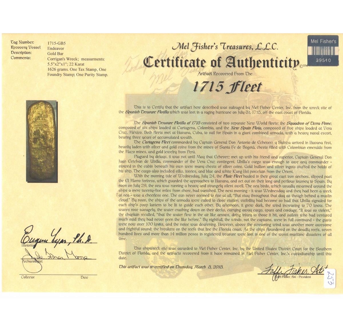 Large Colombian gold bar, 1626 grams, marked with fineness XXII (22K), foundry/assayer BARBAROSA and complete circular tax stamp with lions and castles in a crowned shield, plated in Craig & Richards, from the 1715 Fleet. 5-1/2" x 2" x 5/8". Somewhat rough surfaces (mostly due to pits that are probably from contaminants that were burned or corroded away) but with clear and bold markings, the circular tax stamp very reminiscent of Colombian gold cobs but clearly of Colombian origin anyway based on the foundry/assayer inside an incuse box within a border of dots, the fineness XXII all within a box too, also with modern 5 stamped into the bottom by Treasure Salvors. Curiously, there does not appear to be any sign of an assayer's "bite." Gold bars from the 1715 Fleet are rare and highly in demand. From the 1715 Fleet, plated on page 114 and back cover of Spanish Treasure Bars (Craig & Richards, 2003), with Fisher photo-certificate #1715-GB5.