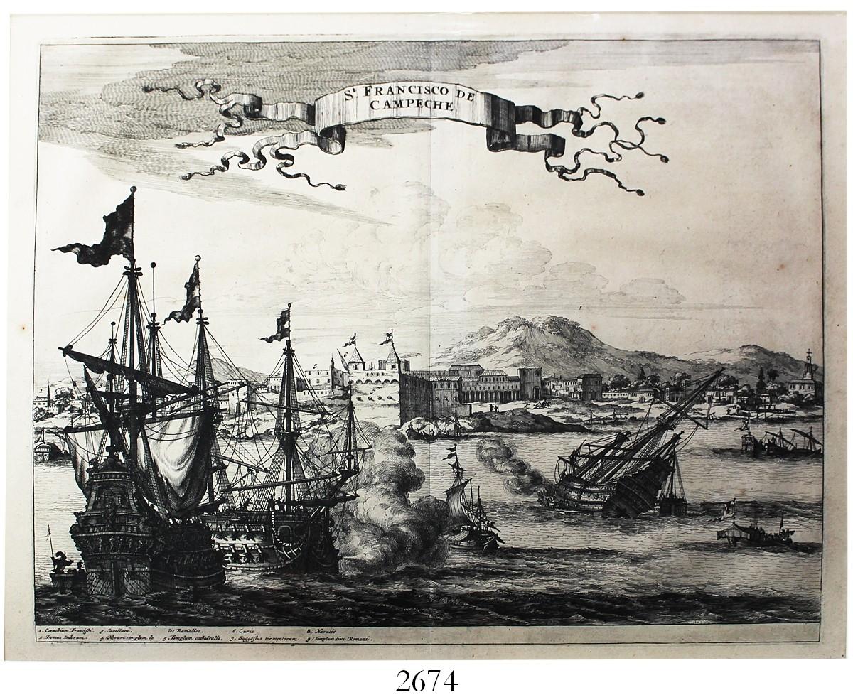 Large, Dutch, woodcut engraving by Pierre Vander Aa (Leiden, 1729) entitled "St. Francisco de Campeche," showing ships in battle off that Mexican harbor (matted). 21" x 18-1/4" (with mat). Three galleons and various smaller ships in battle with guns blazing and lots of smoke, fort and mountains in the background, also the city with various buildings labeled in the legend, mint condition and very well done.