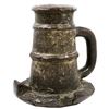 Large Spanish colonial bronze signal cannon (mortar) with rounded bottom, 1600s-1700s. 27 lbs, 7-1/2" tall, 6-1/2" diameter. Sometimes called a "thunder mug," small cannons like this were used as powder-testers and signaling guns, or in this case firing a projectile, this one with heavy brown-green patina, side lift handle, tapered body with ring-turned decoration, base with powder receptacle and vent, rounded bottom, in good condition with some sedimentation in crevices.
