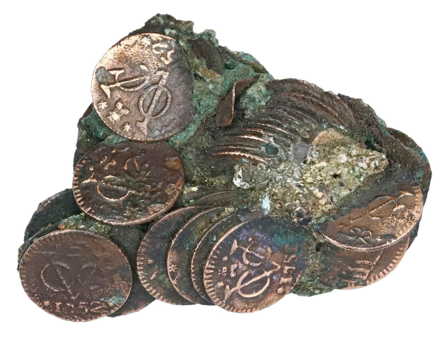 Large, attractive clump of 25-30 Dutch copper duits (Zeeland, 1752). KM-81. 168.48 grams total. Triangular agglomeration of fallen stacks of coins, the top ones fairly well detailed (most with VOC and date showing), with lots of dark encrustation (tinged with green) on bottom and in between, a great display. With original (generic) certificate from the salvagers.Recovered from: Bredenhof, sunk in 1753 off Mozambique