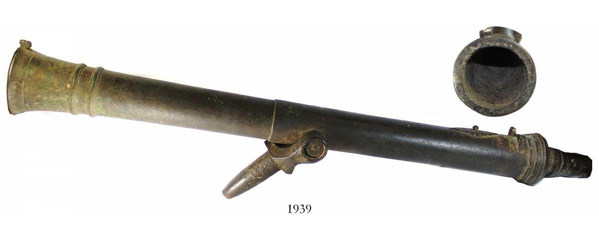 Large bronze swivel cannon, Dutch East Indies, late 1700s-early 1800s. 55 lb; 41" long. Heavy for a swivel cannon, with interestingly flared blunderbuss-type barrel (3-5/8" bore), sights at muzzle and flanking the touch-hole, yoke and trunnions intact, cylindrical cascabel at end (missing the wooden tiller-handle), dark and patinated all over.