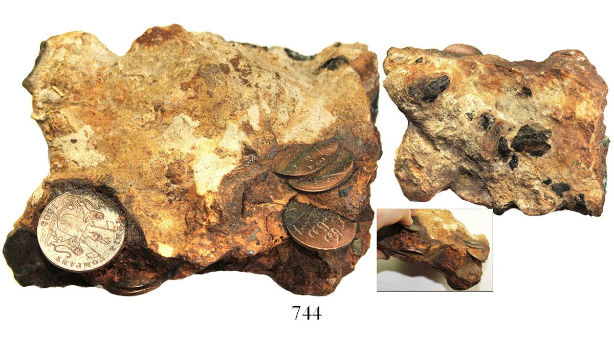 Large clump of 7+ British East India Company copper XX and X cash, 1808, with other small objects inside heavy encrustation. 865 grams total, approx. 5" x 4". A massive chunk of sea-rock with coins and small metal bits peeking out, whitish and orangish all over, the coins quite well preserved and the whole piece a super display, rare to see something like this intact. With photo-certificate. Recovered from: Admiral Gardner, sunk in 1809 southeast of England