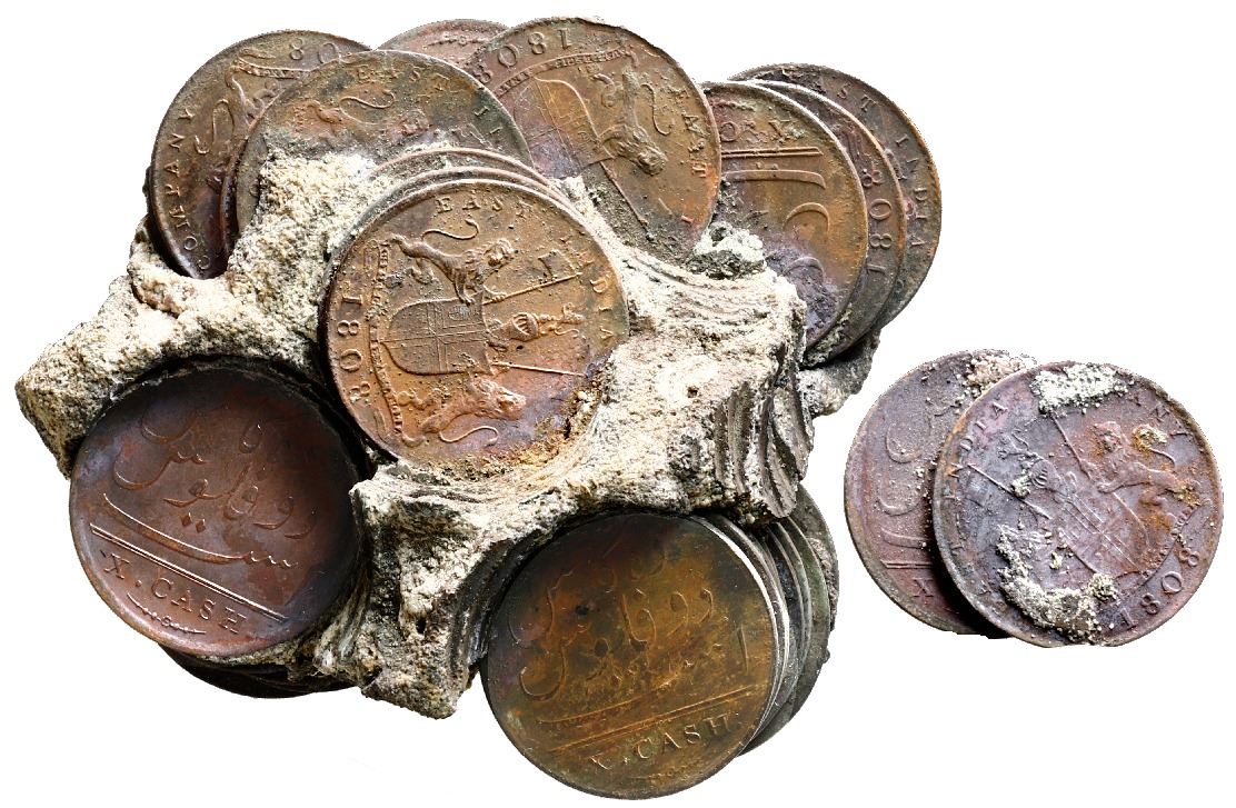 Large clump of approx. 50 English East India Co. copper X cash, 1808 (two separated), encrusted as found. KM-320. 245 grams total, 3" x 3" x 1-1/2". Essentially three or four stacks (one fallen) of intact copper coins (minimal corrosion) with lots of grayish encrustation in between, a few loose (two completely separated from the clump) and all a bit fragile as still in as-found condition. With two small (generic) certificates from the salvor.From: Admiral Gardner, sunk in 1809 southwest of England