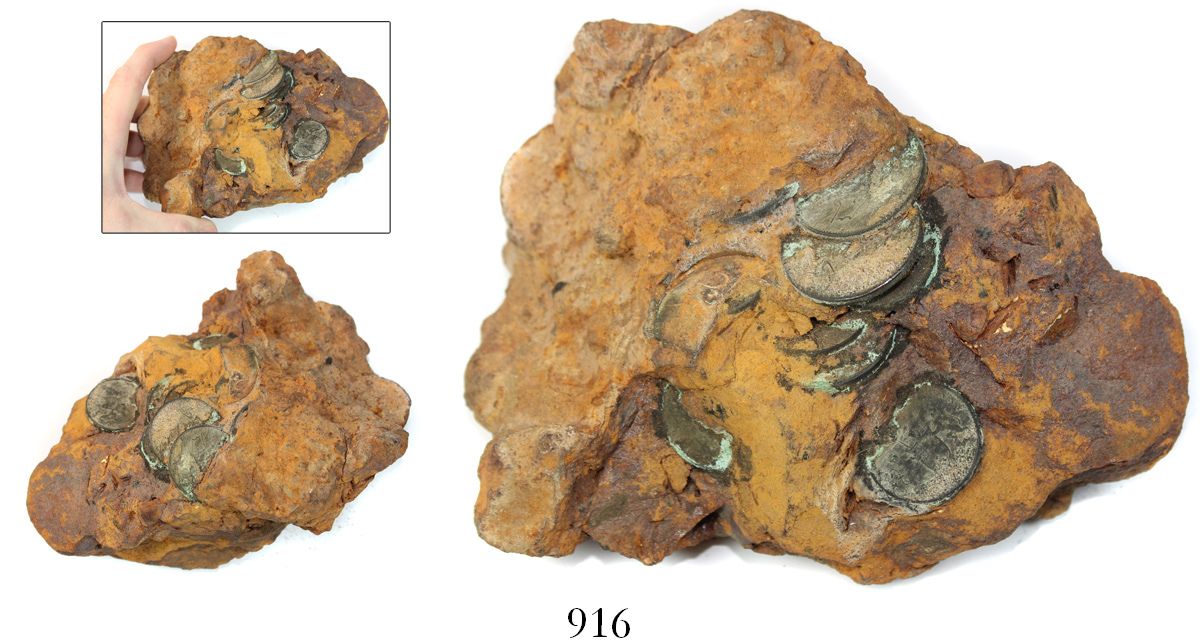 Large clump of over a dozen English East India Co. copper X cash of 1803 embedded in impacted mud that probably hides many more coins, rare provenance. 1570 grams total; roughly 6-1/2" x 5" x 3". Very impressive chunk of orange crud with green-brown coins sticking out, a super display and undoubtedly one of the best artifacts from this somewhat obscure wreck. With original certificate from the salvager. Recovered from: Hindostan, sunk in 1803 off Margate, southeast of England