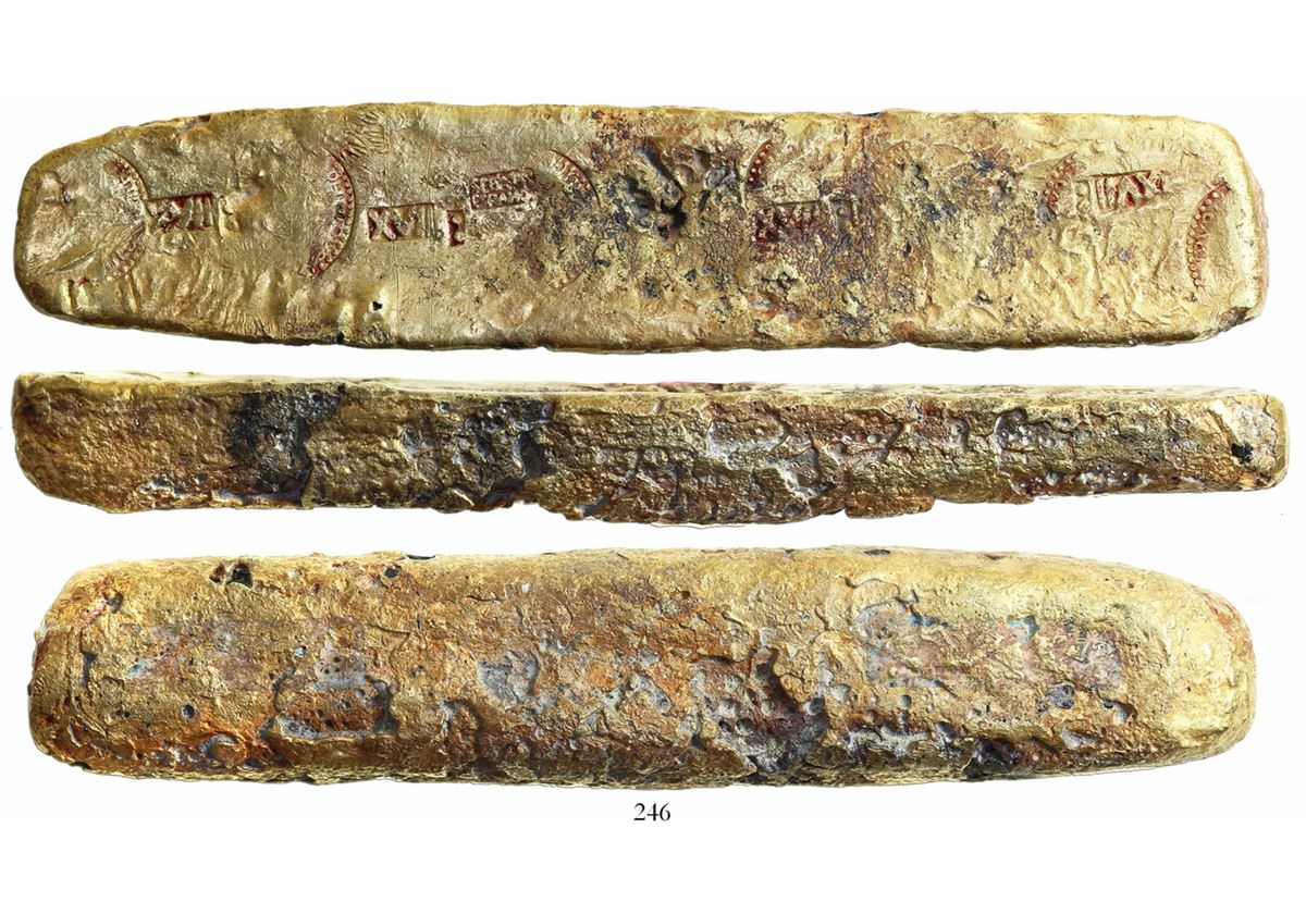 Large, complete gold bar #72, 2271 grams, marked with fineness XVII: (17.5K) and foundry/assayer SEBAST'N / ESPANOL, from the Atocha (1622). 8-1/2" x 1-1/2" x 3/4". A very thick and heavy ingot (NOT a "finger bar"!) with markings littering its top, including four finenesses, seven circular tax stamps and one full and clear foundry/assayer, also with fineness XVII and two parallel lines (in place of dots) lightly inscribed into the surface (probably the assayer's temporary marking before stamping), the whole surface somewhat rough as cast, especially the bottom, which shows lots of red toning and coral in crevices, tiny assayer's "bite" in one corner. From the Atocha (1622), with Fisher photo-certificate #85A-GB072.