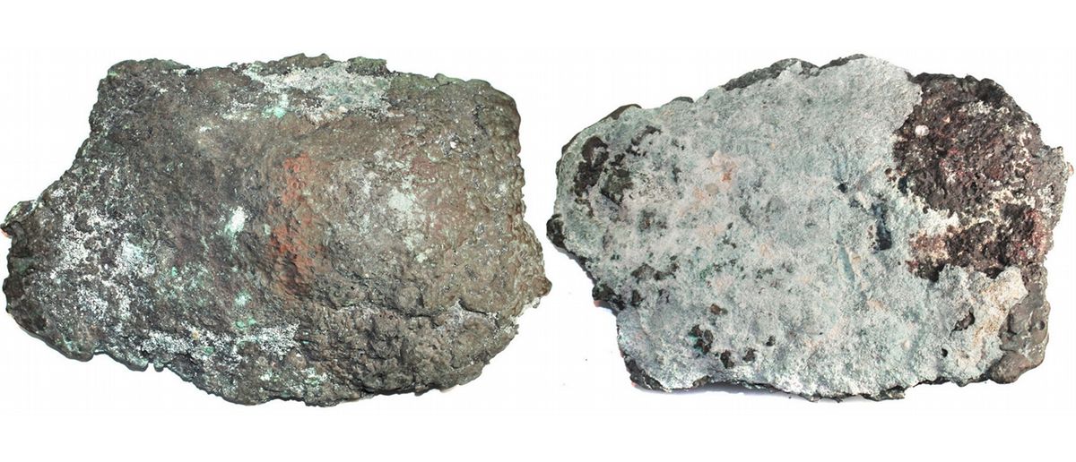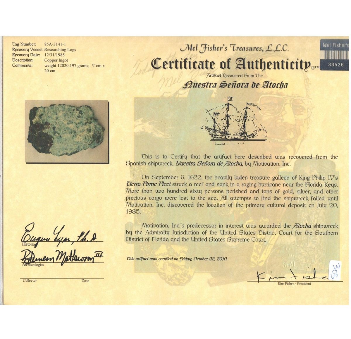 Large copper ingot #3141 from the Atocha (1622), heavily encrusted, 32 lb troy. Approx. 12" x 8" x 4". A typically crude mound of pure copper (probably mined in Cuba), with an attractive crust of greenish-white encrustation on the flat side (otherwise brown), great conversation piece. From the Atocha (1622), with Fisher photo-certificate #85A-314101 and original 1987 division letter and computer print-out to receiving investor.