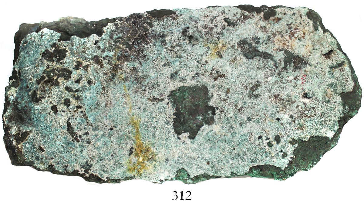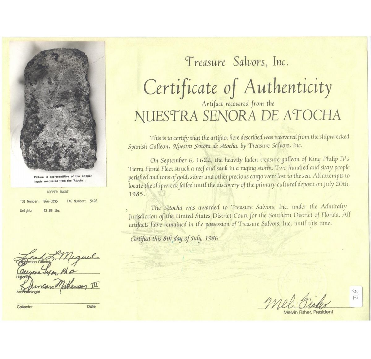 Large copper ingot from the Atocha (1622), 42 lb av. About 17" x 8" x 2". Somewhat rectangular but typically crude mound of pure copper (probably mined and cast in Cuba) with an attractive crust of green-white encrustation on both sides, heavy and impressive. From the Atocha (1622), with Fisher photo-certificate #86A-C095.