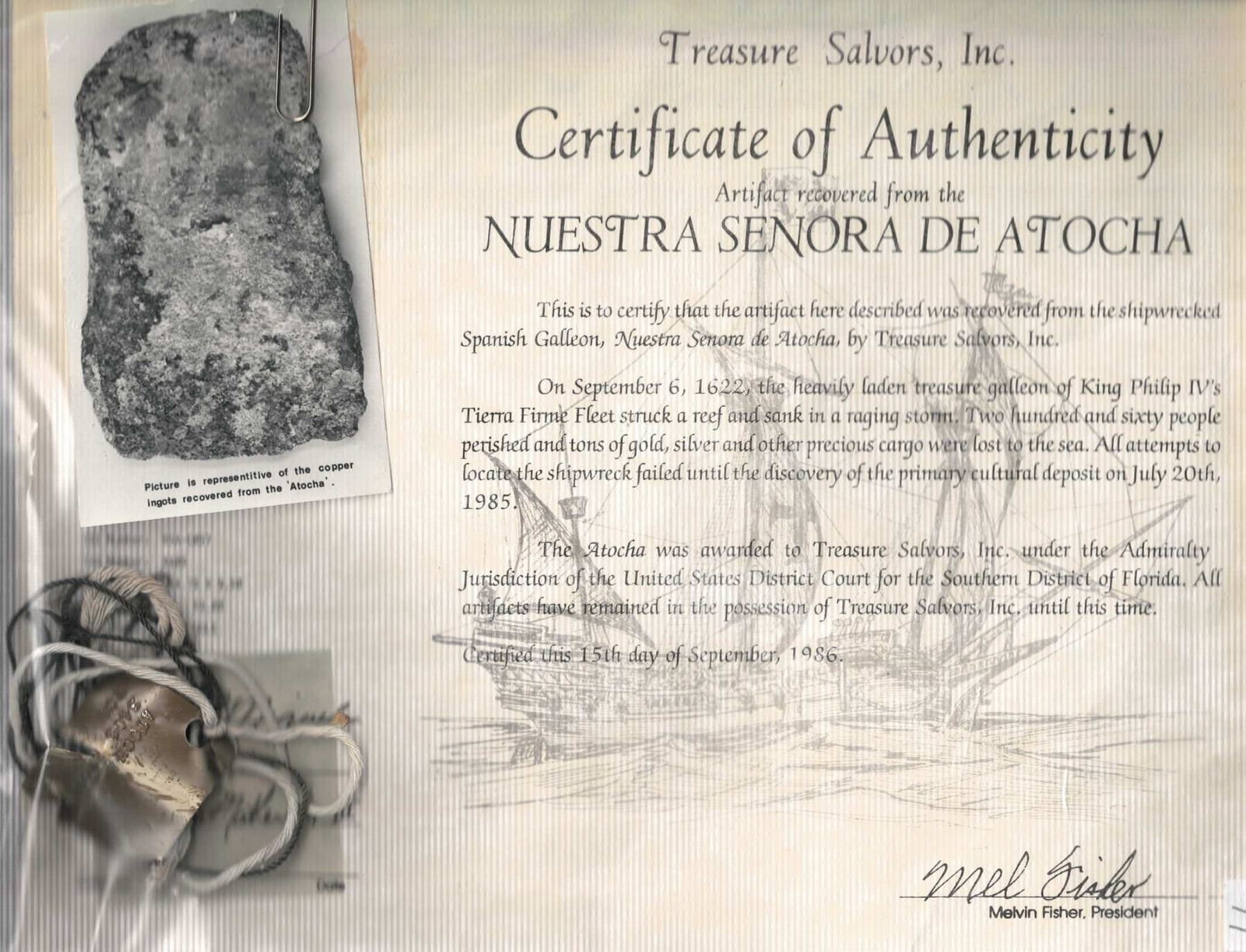 Large copper ingot with encrustation, 59 lb, ex-Atocha (1622), ex-Auerbach. 15" x 9" x 3". Unusually rectangular but still typically crude, the flattish top almost completely encrusted in white-and-green encrustation that extends to the rough and rounded bottom in a few places, the metal surface itself dark brown with spots of orange, an impressively large item from this popular shipwreck. From the Atocha (1622), with original Fisher plastic tag and photo-certificate 85A-C057, pedigreed to the Stuart Auerbach collection (Sedwick Auction 25, with original lot-tag 221).