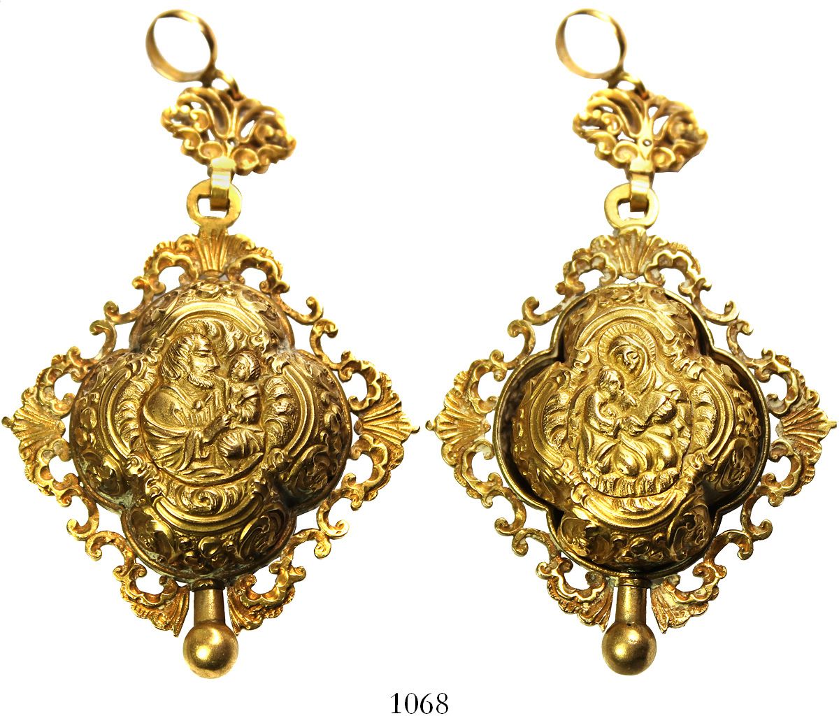 Large gold reliquary pendant with ornate border and hanger. 28.17 grams, about 3-1/2" x 2" x 3/4" overall. This fabulous locket must have once contained a very significant relic, as the inside chamber measures about 1-1/4" x 1-3/8" x 3/4" in four lobes, although now it is empty save for a light veneer of attractive white encrustation, its two halves kept together by a screw-in fob at bottom, the exterior showing Mary and the Christ child on one side and Joseph with the Christ child on the other, the sides surrounded by scrollwork and plumes, with a matching hanger at top connected by loops, all in high-grade gold and in excellent condition. The design and character of this piece mirrors what has been seen from the Spanish 1715 and 1733 Fleets. Recovered from: Unidentified mid-1700s wreck off South America