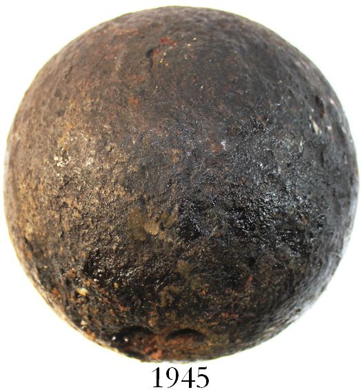 Large iron cannonball, probably 1700s. 16-1/4 lb; 5" in diameter. Rusty and pitted but solid and intact, with prominent casting seam in middle. Pedigreed to the Henk L. Visser collection (Bonhams Knightsbridge, November 28, 2007).