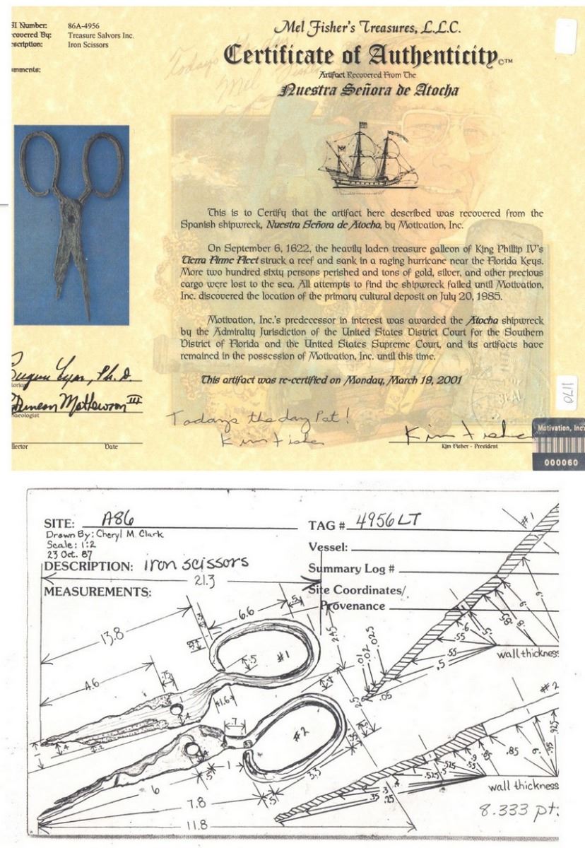 Large iron shears, professionally conserved. 659 grams, 9", the case 12" x 8-1/4". Remarkably intact despite corrosive loss, just the central pin and bits of the exterior missing, now sealed in black coating, very recognizable in shape and desirable as from this famous wreck. Housed in glass-top "Riker" case, with Fisher photo-certificate #86A-4956. Recovered from: Atocha, sunk in 1622 west of Key West, Florida