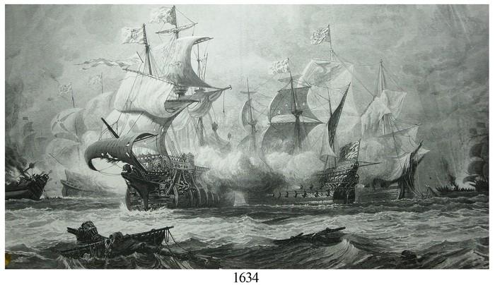Large, late 18th/ early 19th-century engraving of ships in battle. 18½" x 10½". A beautiful engraving depicting an intense battle between galleons and other ships, nice condition save for small missing piece at bottom left and a crease as originally folded inside a book.