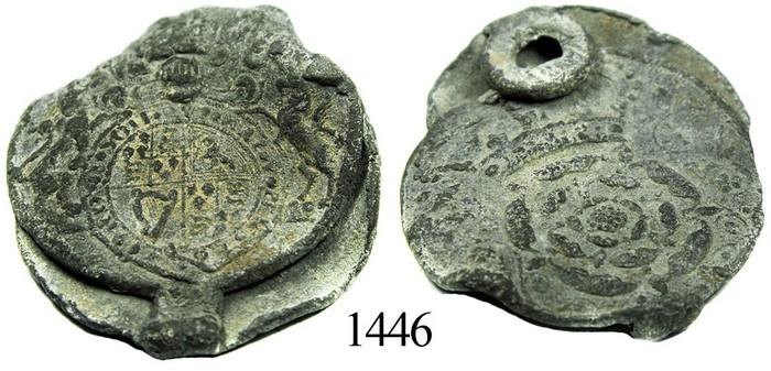 Large lead cloth seal with Tudor rose and British arms designs. 43 grams, 1-7/8" in diameter. This is one of the most detailed seals we have ever seen, with a big, crowned Tudor rose on one side and a full British coat-of-arms on the other side, the seal itself complete but slightly wrinkled and lightly dusted with encrustation. Recovered from: Nuestra Señora de los Milagros, sunk in 1741 off the Yucatán Peninsula of Mexico. With Robert Marx certificate.