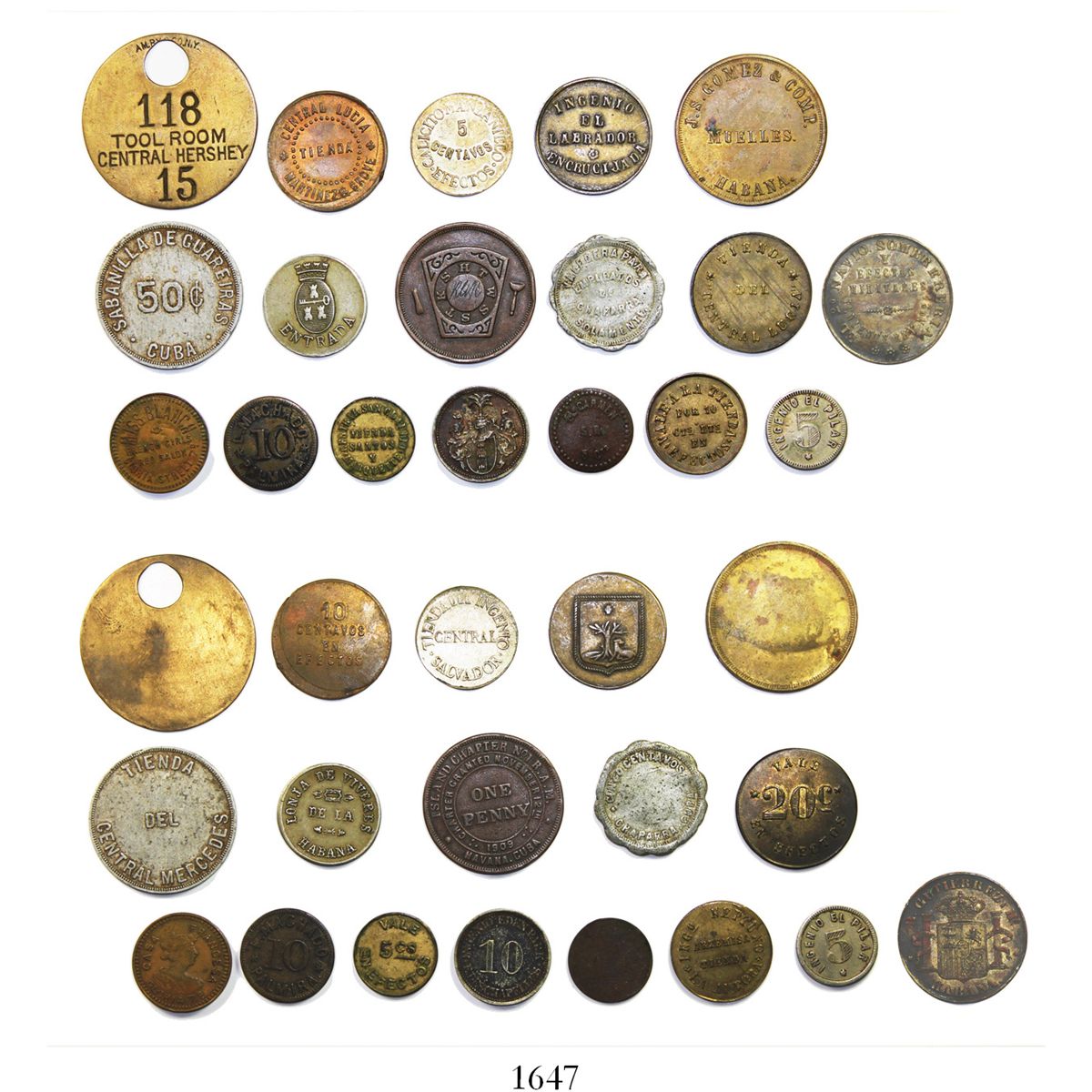 Large lot of 18 tokens from Cuba, various metals, 1800s to early 1900s, some rare.