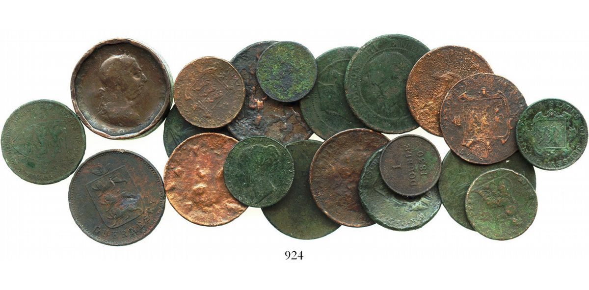 Large lot of 20 miscellaneous copper coins of France, Germany, Great Britain, Guernsey and Jersey (Channel Islands), including one British halfpenny with hammered-in edge for gaming. 146.8 grams total. Mostly corroded but with enough details to attribute at least the country of origin, mostly dark brown but a few red and many with green, one with large hole in center, the gaming piece uncorroded and rather interesting. Recovered from: Unidentified mid-1800s wreck in the English Channel