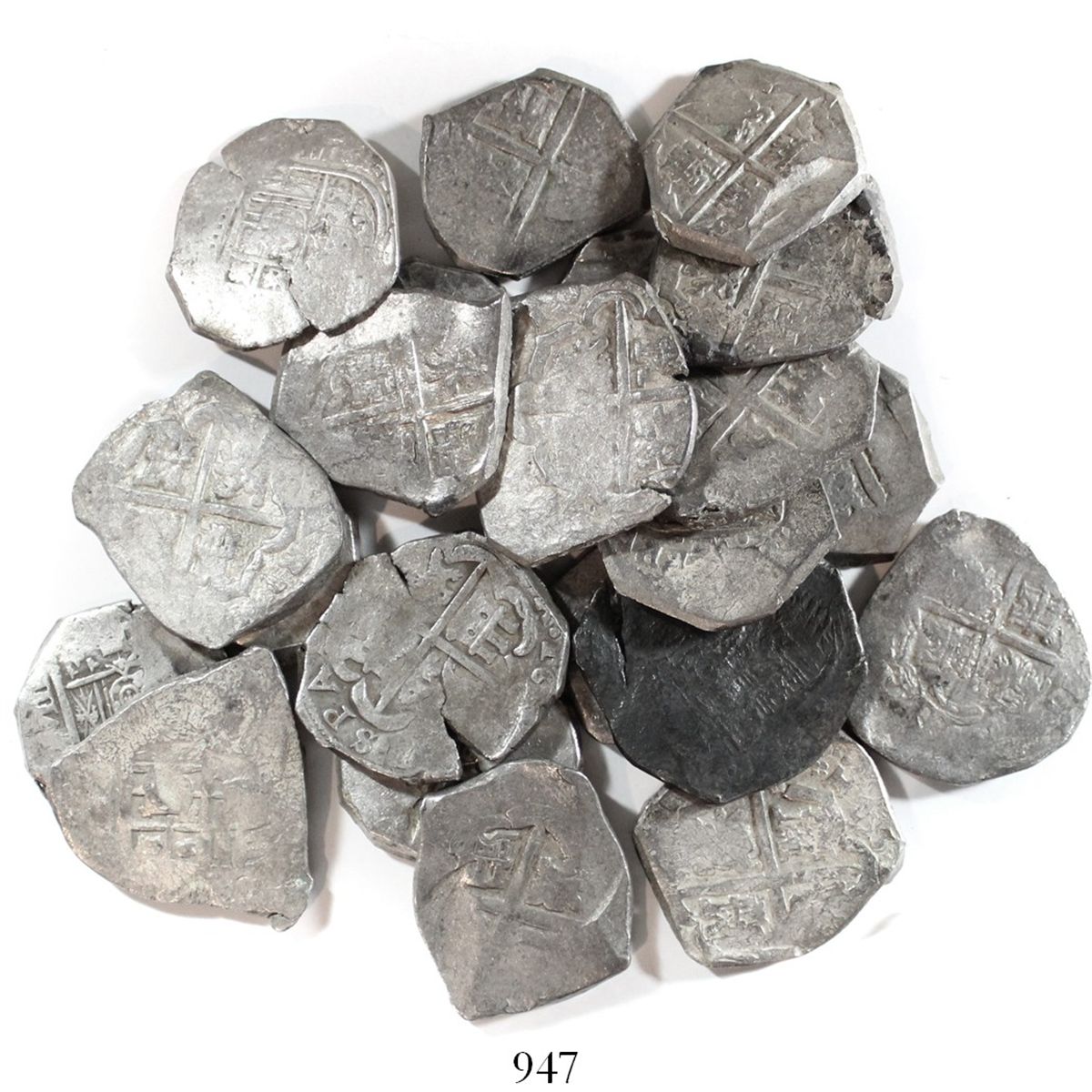 Large lot of 22 Spanish cob 8 reales, Philip II through Philip IV, some with mintmarks and/or assayers visible. 235.5 grams total. Solid coins with generally good shields and crosses, AVF on average, one darkly toned and cut, a fun and challenging lot for study or resale.