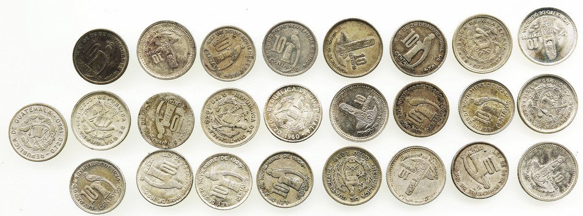 Large lot of 25 Guatemala 10 centavos: 1925, 1929 (2), 1932, 1933 (2), 1934, 1945 (3), 1947 (2), 1949, 1953 (2), 1955 (2), 1957, 1958 (2), 1959 (2), 1960 (2) and 1964. 82.7 grams total. VF to BU (fairly equal distribution of grades), none damaged, some toned, the higher-grade specimens lustrous, a nice date-run (with duplicates) of silver 10c.