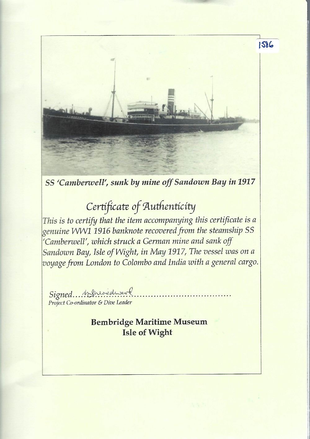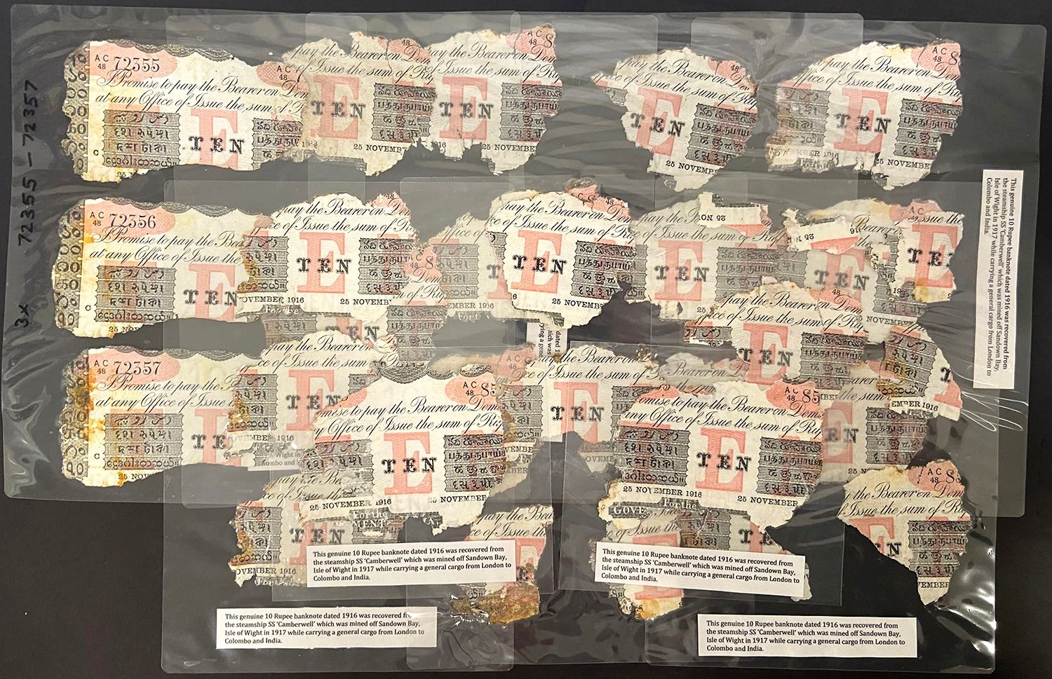 Large lot of 28+ Calcutta, British India, 10 rupees notes (mostly fragments), 25-11-1916, series AC, three with sequential serial numbers 72355-57 visible, all laminated (ten sheets). SCWPM-A10h. Varied group with several fragmented notes but most partially intact (including three with full serial numbers) with light staining. With original certificate from the salvor. From: S.S. Camberwell, sunk in 1917 off the Isle of Wight, south of England